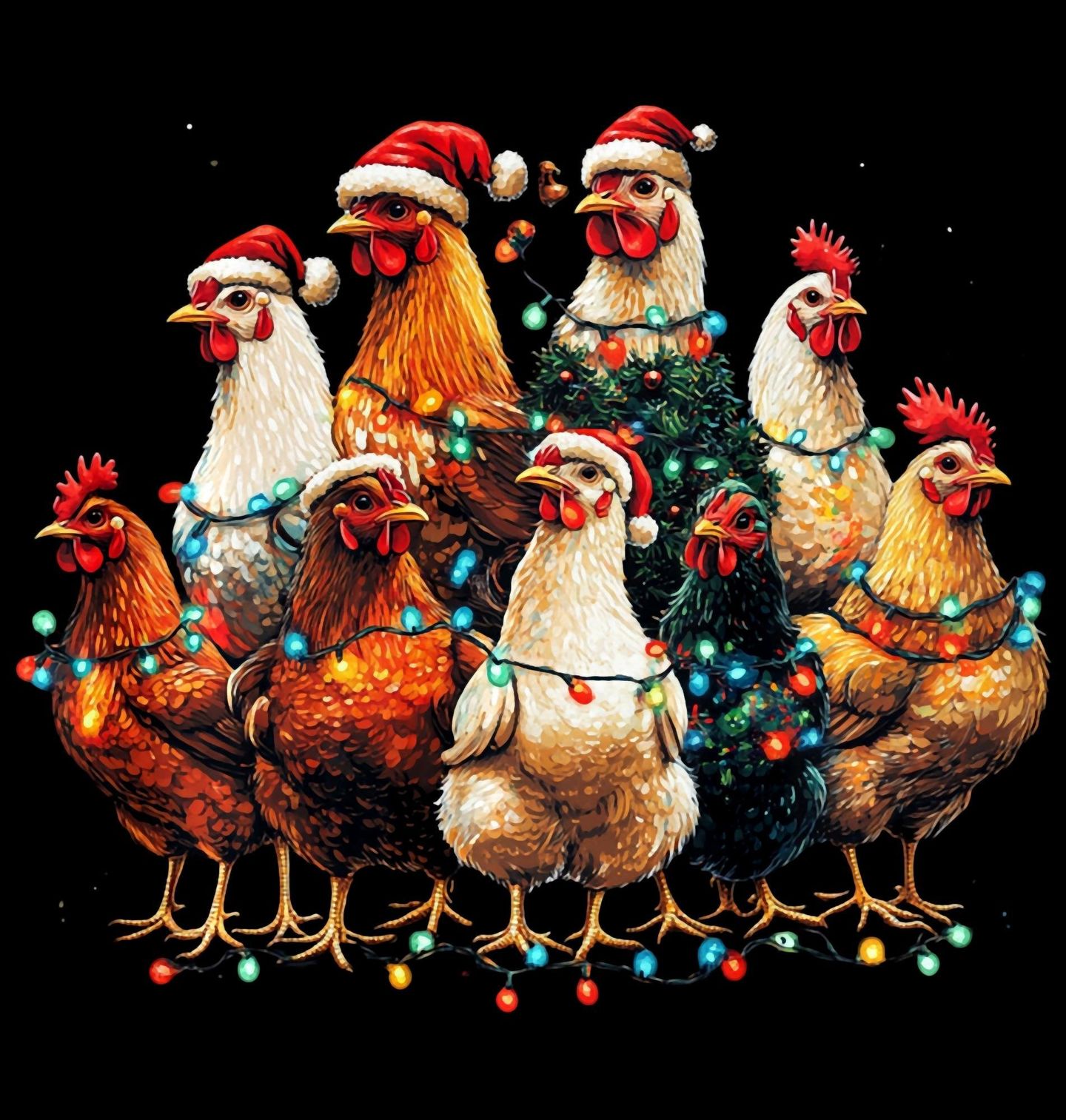 Pánské tričko Vánoční slepice v Záři Světýlek. Veselý motiv, který vám vykouzlí úsměv na tváři – slepice oblečené do vánočních čepic a ozdobené barevnými světýlky připomínají, že Vánoce může slavit opravdu každý kurník. Tento originální potisk spojuje tradiční symboly Vánoc s humorem a venkovskou atmosférou.
