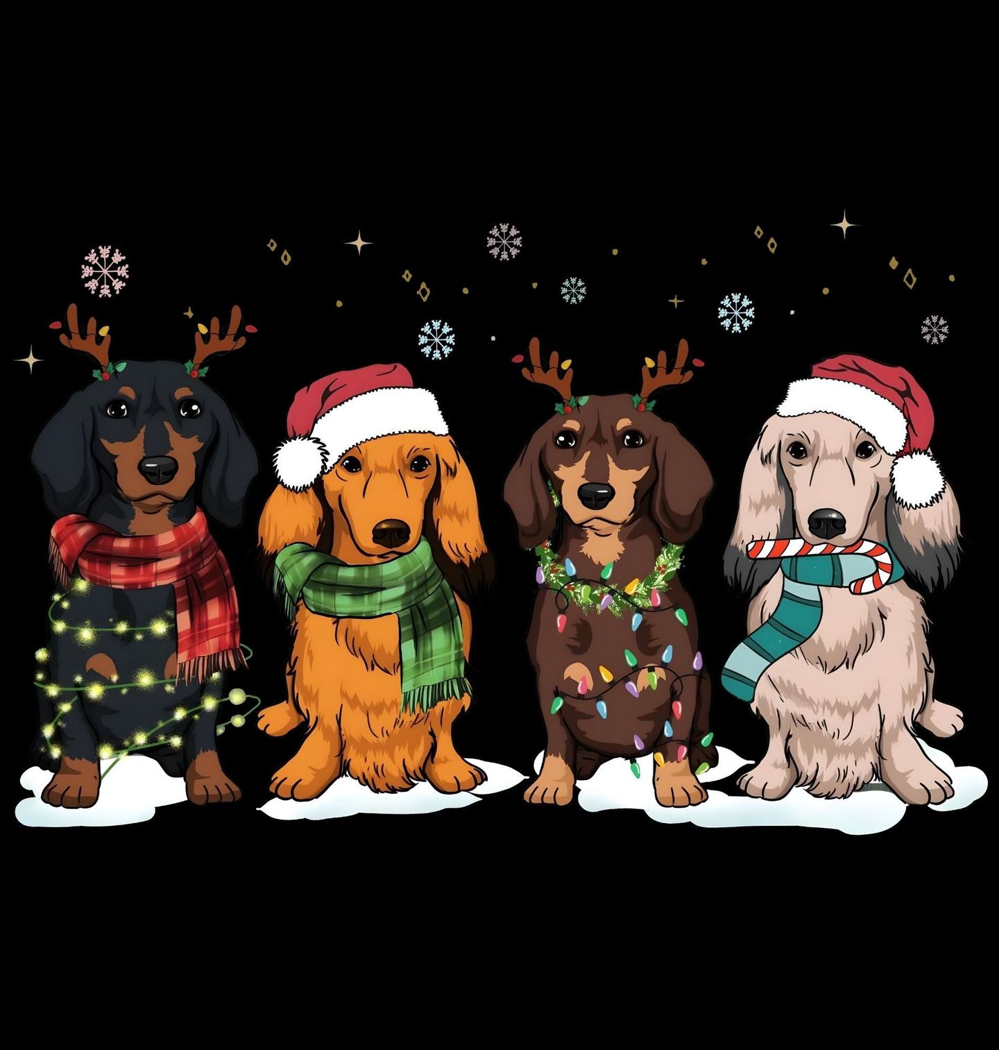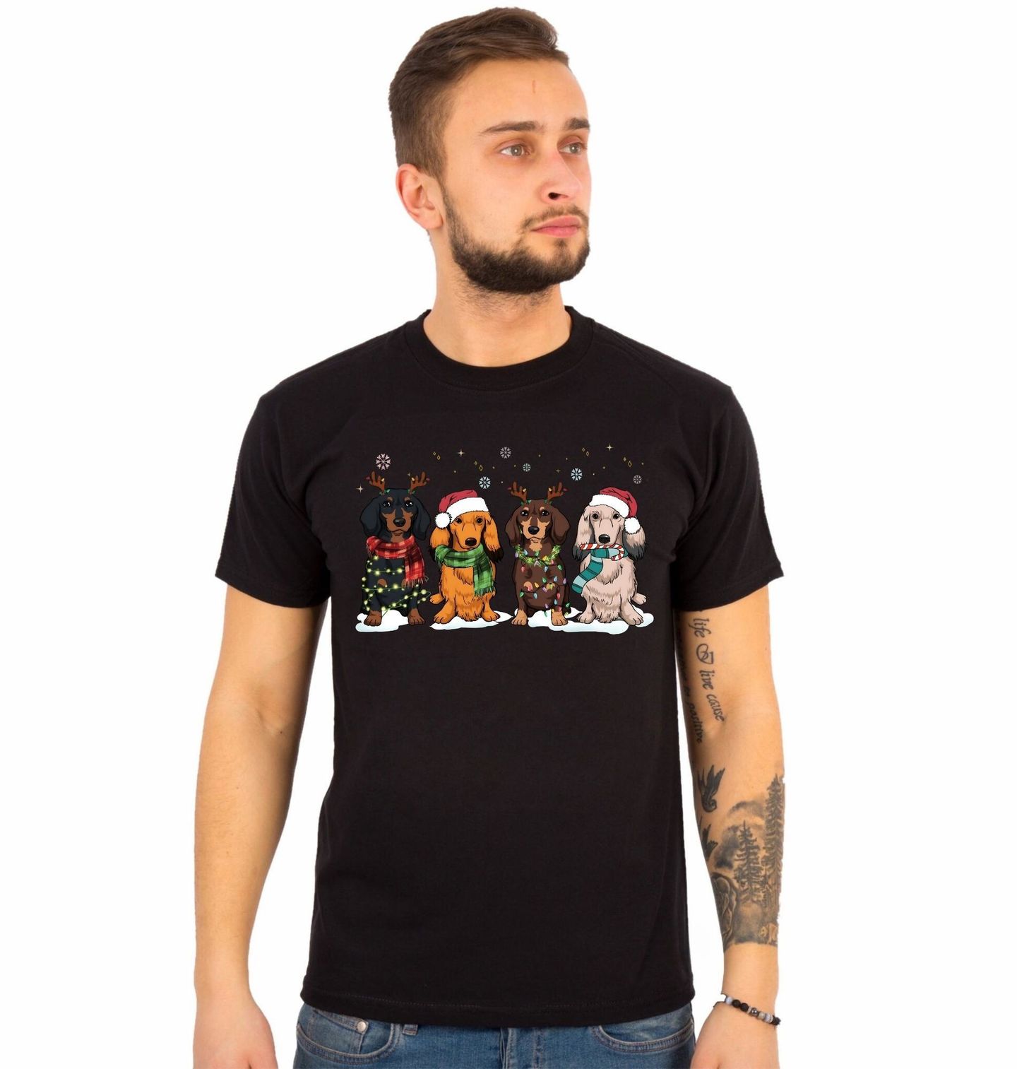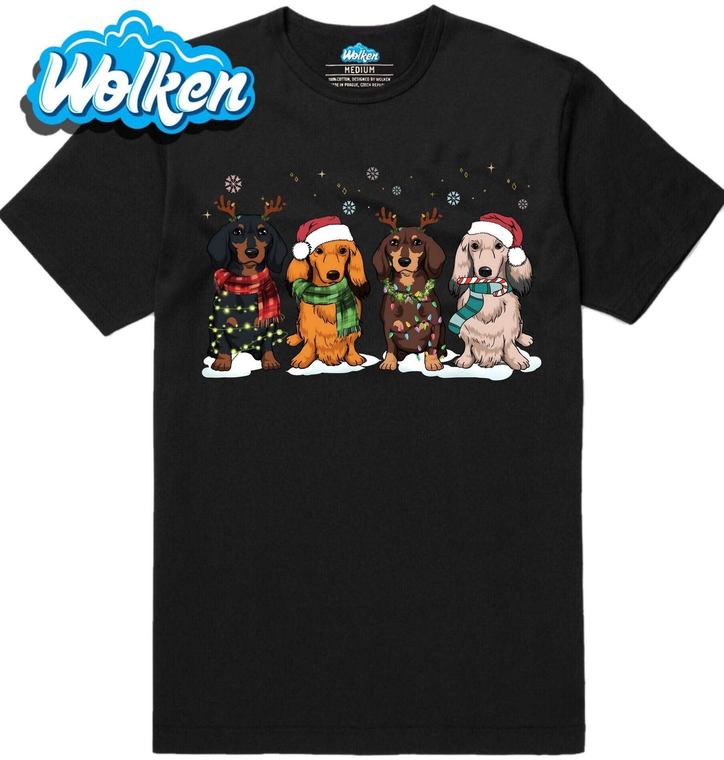 Pánské tričko Vánoční Smečka Jezevčíků. Vánoce jsou kouzelné – a s jezevčíky ještě o něco veselejší! Tento roztomilý motiv zachycuje čtyři jezevčíky (černý hladkosrstý, rezavý, hnědý a světlý) ve vánočním stylu, ideální pro každého pejskaře a pro toho, čí je pes je jeho nejlepším přítelem.