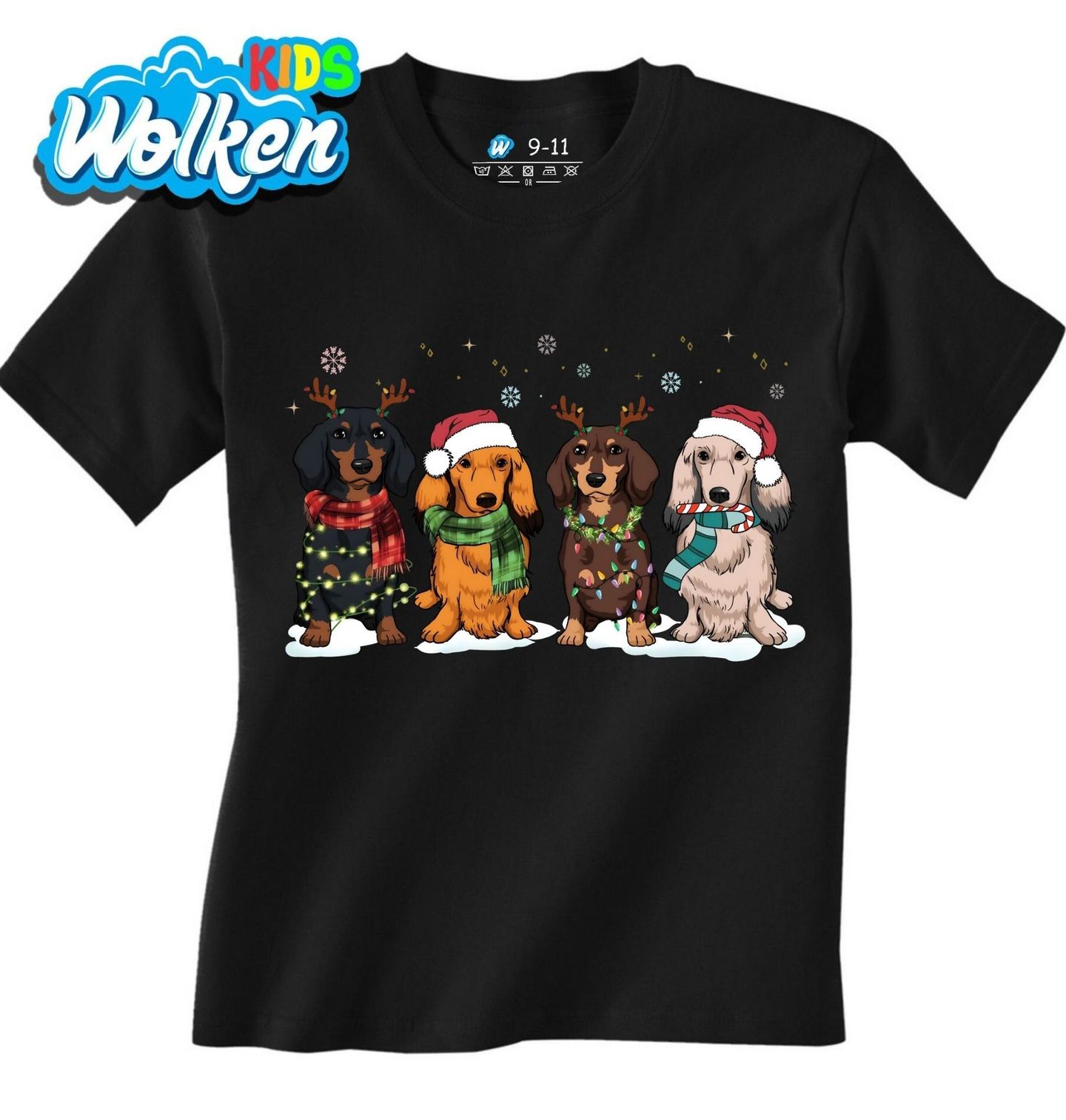 Dětské tričko Vánoční Smečka Jezevčíků. Vánoce jsou kouzelné – a s jezevčíky ještě o něco veselejší! Tento roztomilý motiv zachycuje čtyři jezevčíky (černý hladkosrstý, rezavý, hnědý a světlý) ve vánočním stylu, ideální pro každého pejskaře a pro toho, čí je pes je jeho nejlepším přítelem.