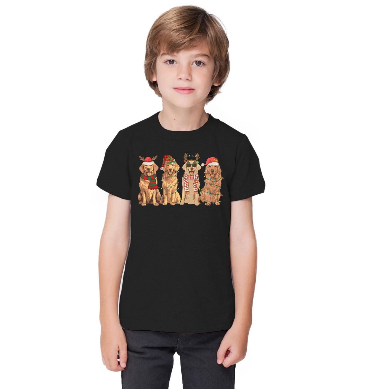 Dětské tričko Vánoční Smečka Zlatých Retrívrů. Připravte se na nejroztomilejší Vánoce se čtveřicí zlatých retrívrů, kteří vám vykouzlí úsměv na tváři! Každý pes má vlastní styl – od sobích parůžků přes santovskou čepici až po brýle a šálu. Vánoce jsou ideální příležitostí potěšit každého pejskaře originálním dárkem s motivem jeho oblíbeného plemene.