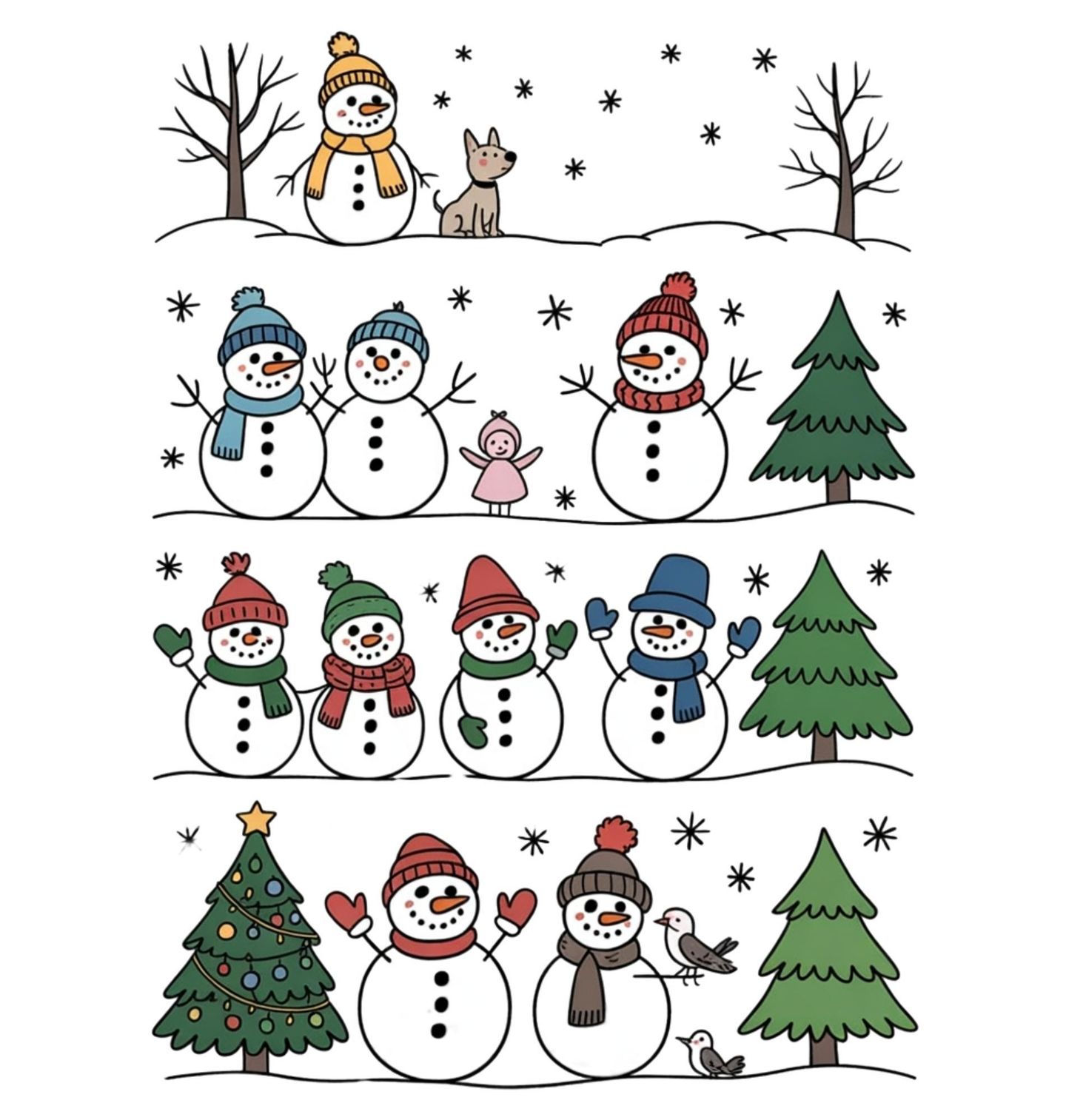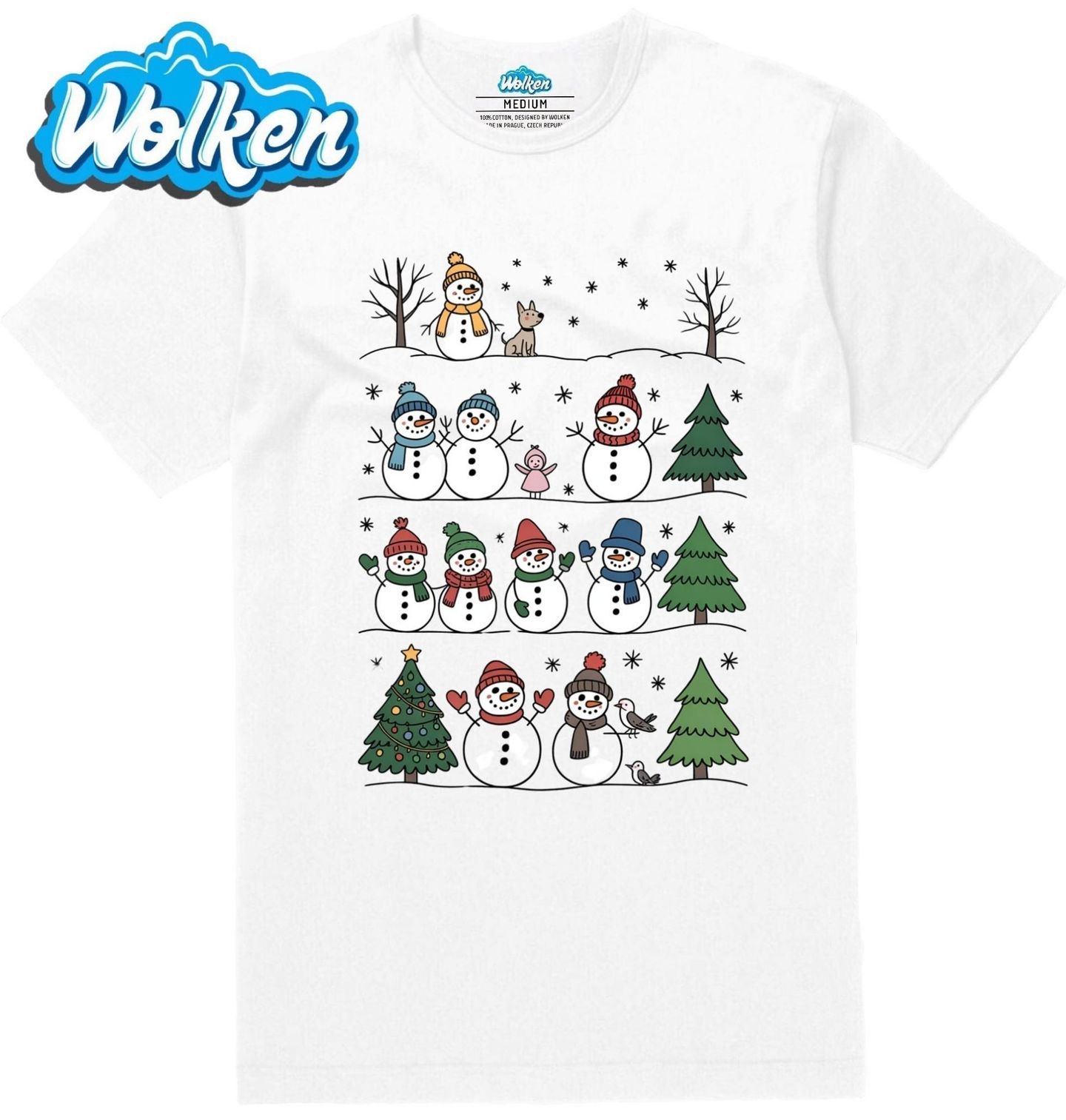 Pánské tričko Vánoční Sněhuláci. Roztomilý motiv sněhuláků slavících Vánoce u zasněženého lesa přináší radost, pohodu a kouzelnou zimní atmosféru. Na motivu najdete usměvavé sněhuláky v barevných čepicích a šálách, zdobený vánoční stromek, vločky i zvířátka, která dotvářejí hravou a přátelskou scénu.