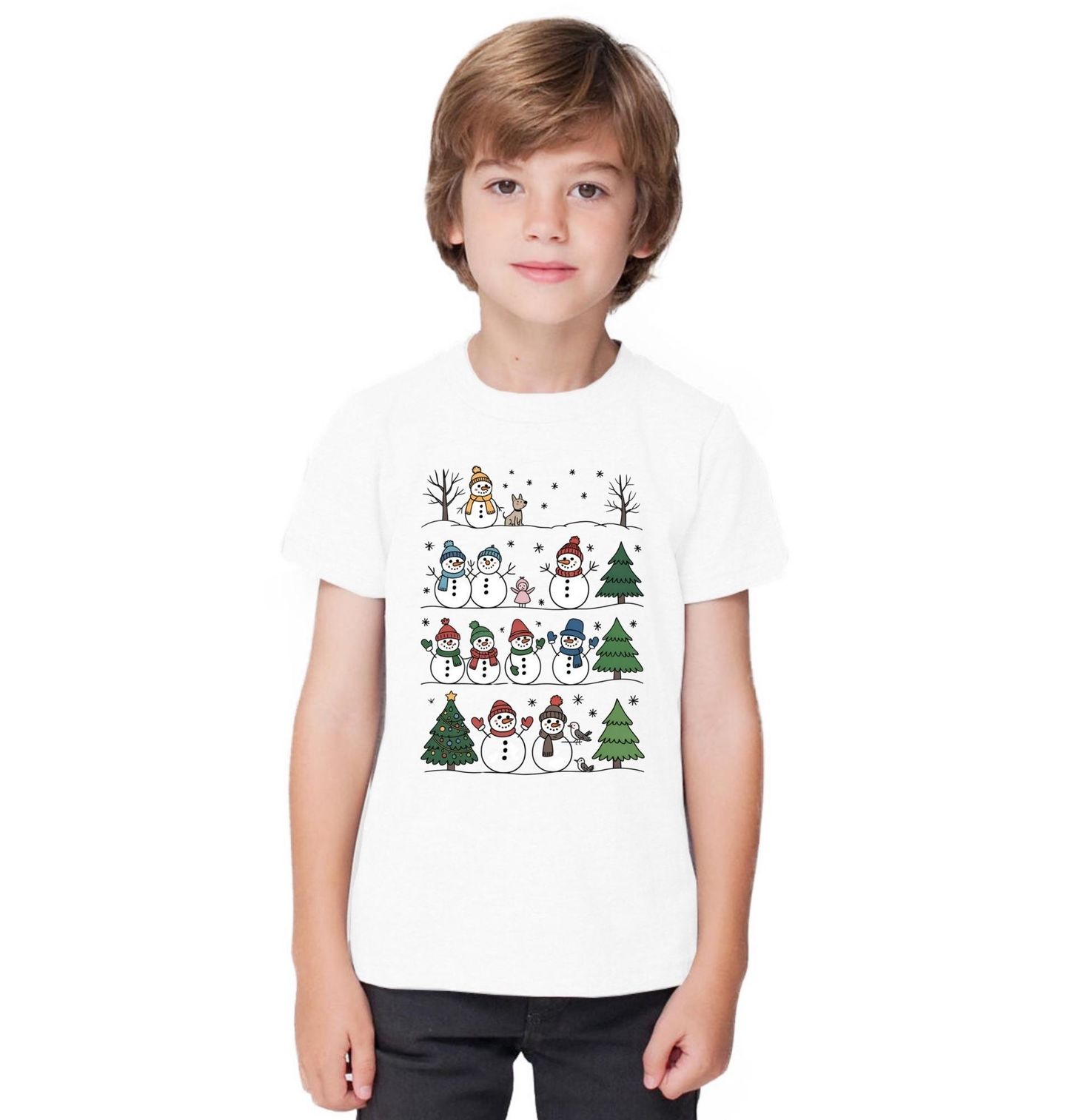 Dětské tričko Vánoční Sněhuláci. Roztomilý motiv sněhuláků slavících Vánoce u zasněženého lesa přináší radost, pohodu a kouzelnou zimní atmosféru. Na motivu najdete usměvavé sněhuláky v barevných čepicích a šálách, zdobený vánoční stromek, vločky i zvířátka, která dotvářejí hravou a přátelskou scénu.