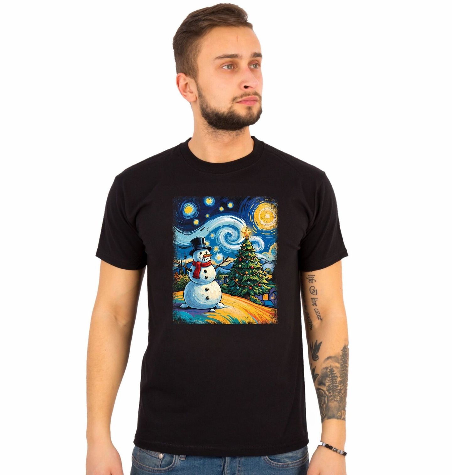 Pánské tričko Vánoční Sněhulák ve Hvězdné noci. Tento kouzelný motiv kombinuje ikonický styl slavného malíře Vincenta van Gogha a Vánoce. Ve vířivém pozadí připomínajícím jeho slavný obraz Hvězdná noc stojí usměvavý sněhulák s červenou šálou vedle ozdobeného vánočního stromku pod hvězdným nebem.