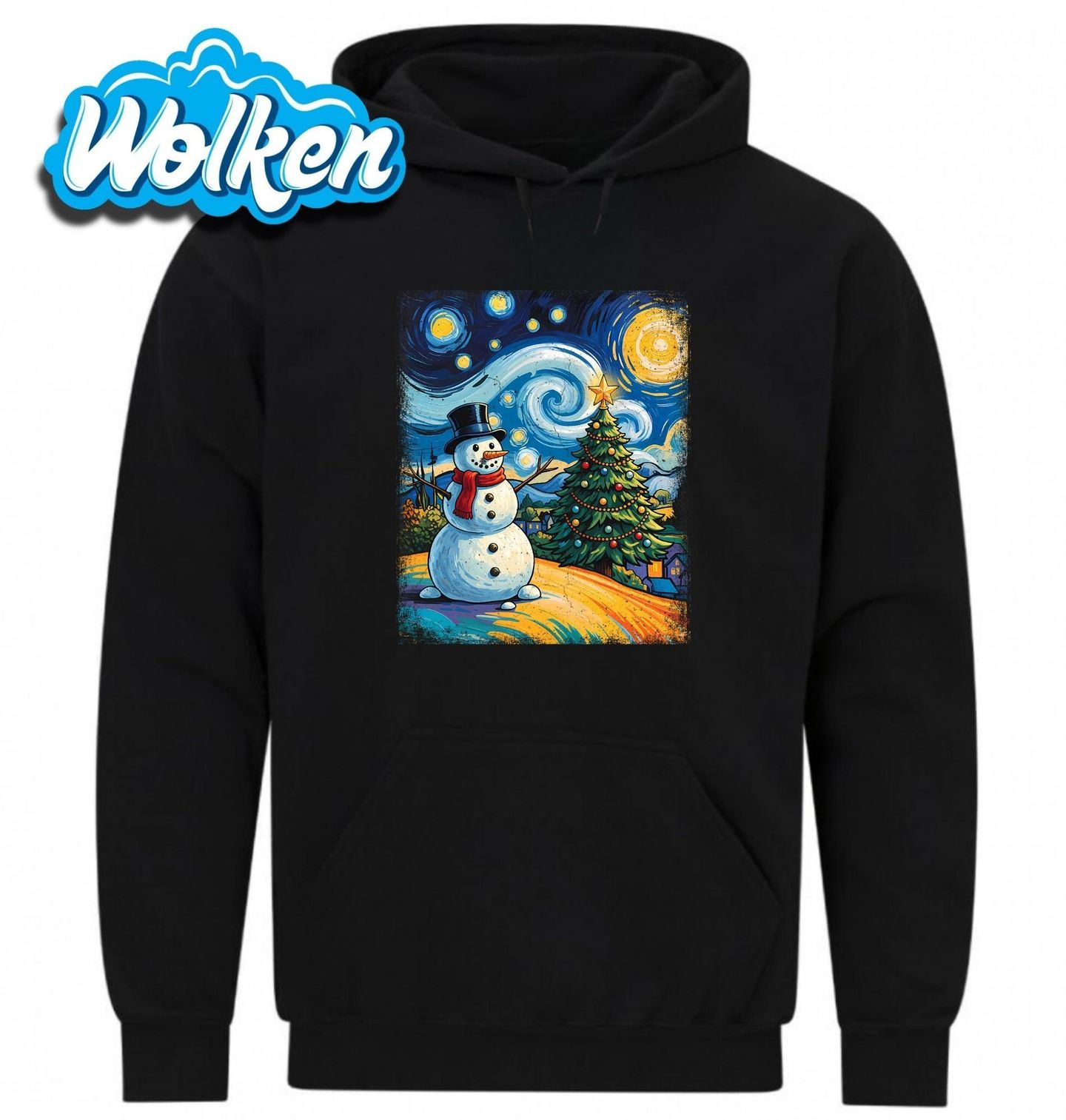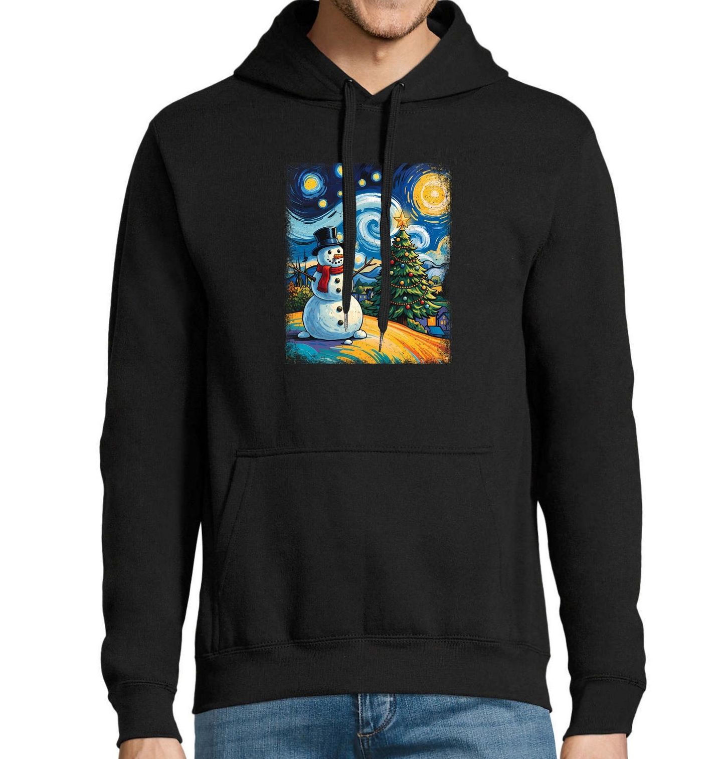 Pánská mikina Vánoční Sněhulák ve Hvězdné noci. Tento kouzelný motiv kombinuje ikonický styl slavného malíře Vincenta van Gogha a Vánoce. Ve vířivém pozadí připomínajícím jeho slavný obraz Hvězdná noc stojí usměvavý sněhulák s červenou šálou vedle ozdobeného vánočního stromku pod hvězdným nebem.