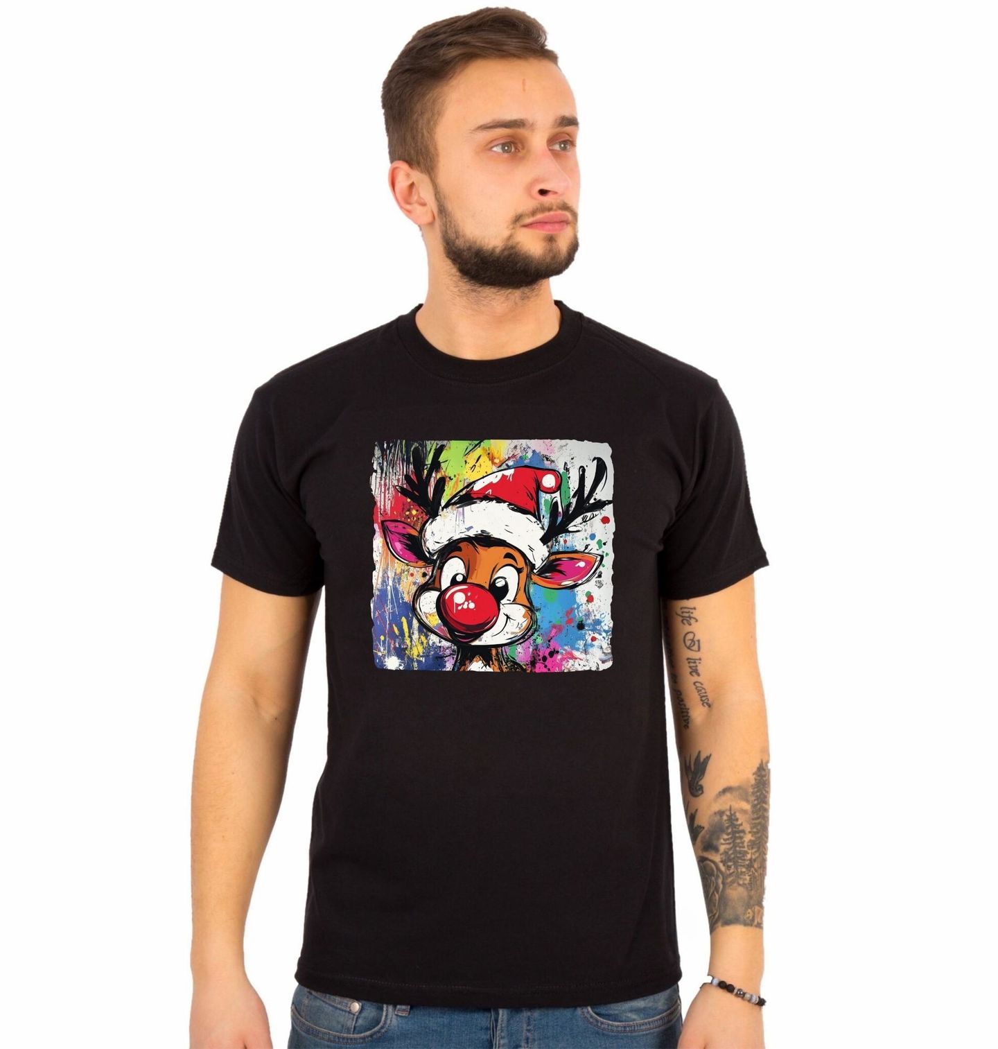 Pánské tričko Vánoční Sob Rudolf Graffiti. Ikonický sob Rudolf s červeným nosem v netradičním street-art stylu je veselý, bláznivý a hravý – přesně tak, jak by měly svátky vypadat. Barevné pozadí plné sprejových efektů a veselý výraz Rudolfa z něj dělají ideální potisk pro každého, kdo chce oslavit Vánoce trochu jinak.