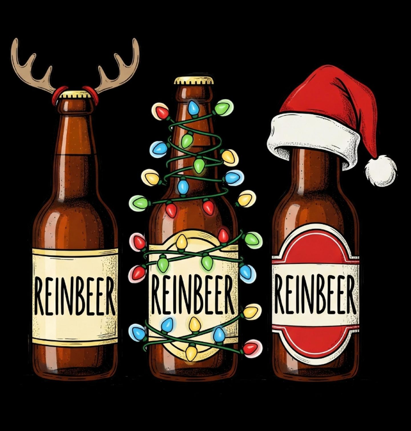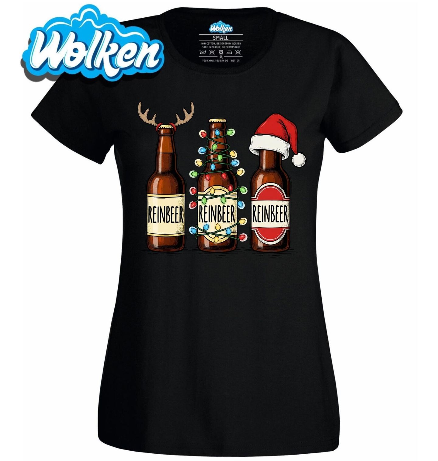 Dámské tričko Vánoční Sobí Lahváče REINBEER. Originální a vtipný motiv „REINBEER“ spojuje sváteční Vánoce, milovaného soba a samozřejmě dobře vychlazené pivo! Tři lahve ozdobené jako sob, vánoční stromek a Santa přinášejí hravou kombinaci alkoholu a sváteční atmosféry. Skvělý motiv pro všechny, kdo si chtějí Vánoce zpříjemnit poctivým pivem a dávkou humoru.
