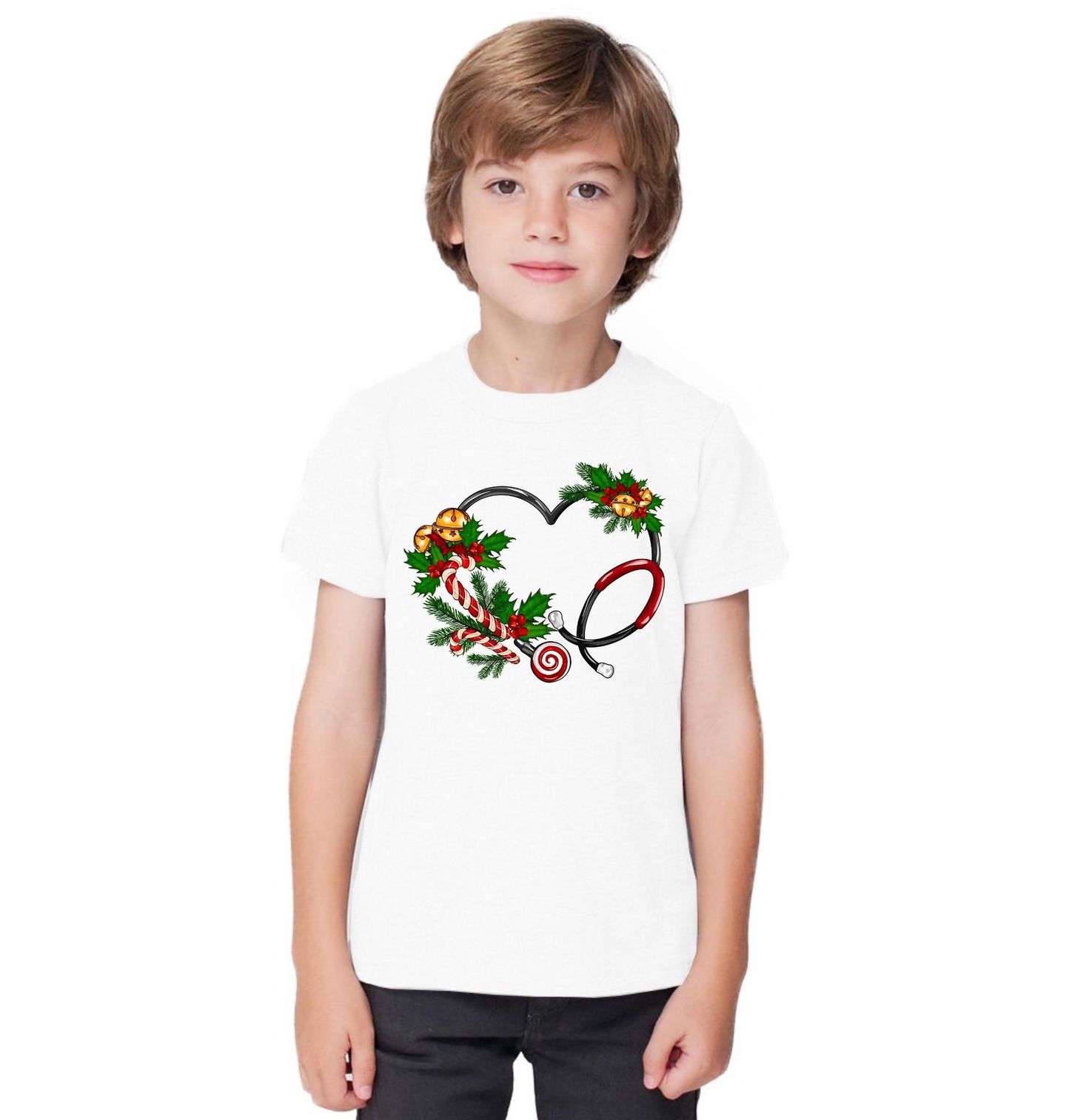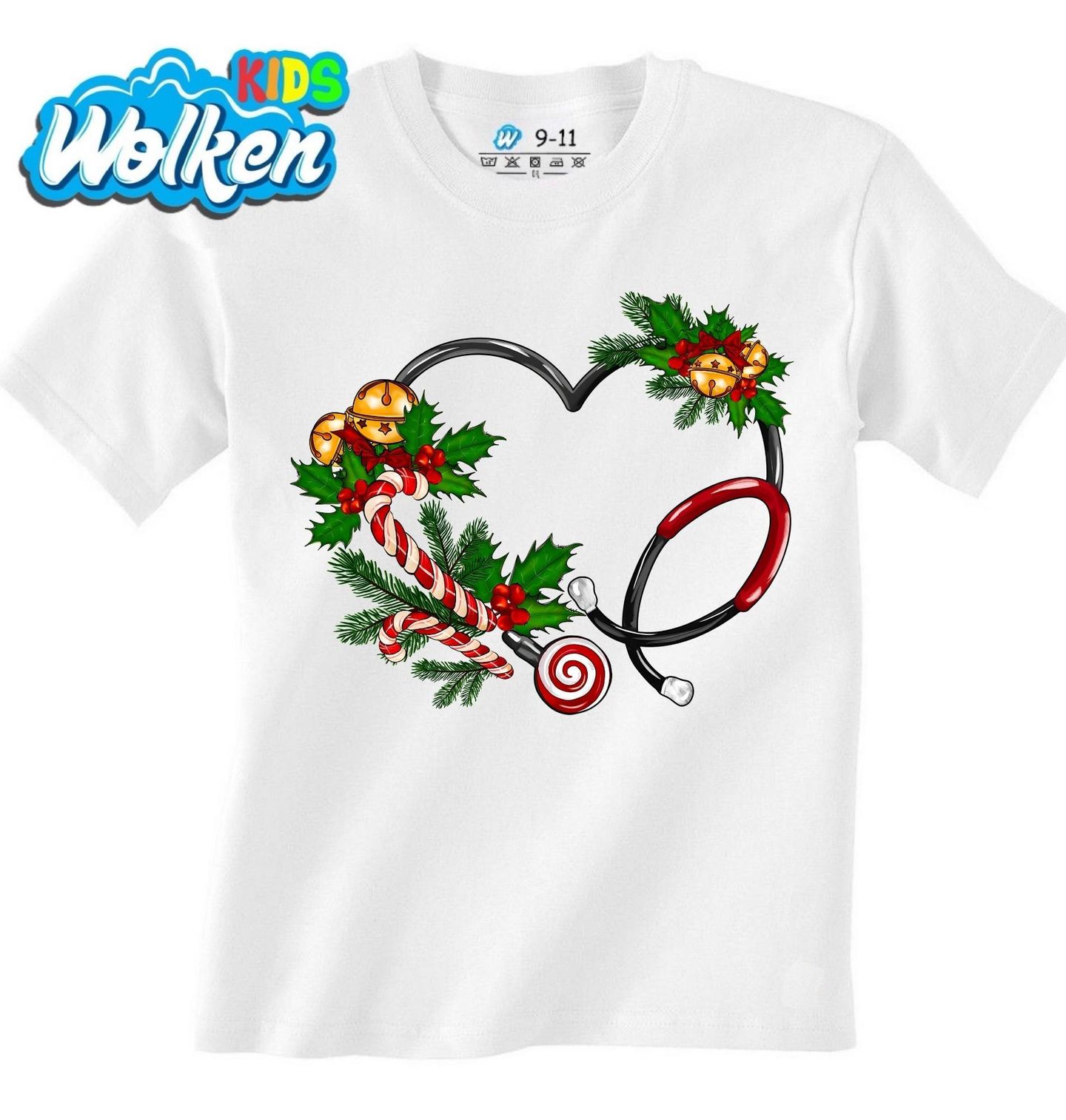 Dětské tričko Vánoční Srdce Lékaře. Stylizované srdce ze stetoskopu doplněné o vánoční prvky jako jsou větvičky, rolničky, lízátka a cukrová hůlka symbolizuje spojení péče a sváteční nálady. Ideální dárek na Vánoce pro všechny doktory, kdo v nemocnici, ordinaci nebo lékárně rozdávají péči, úsměv a lásku.