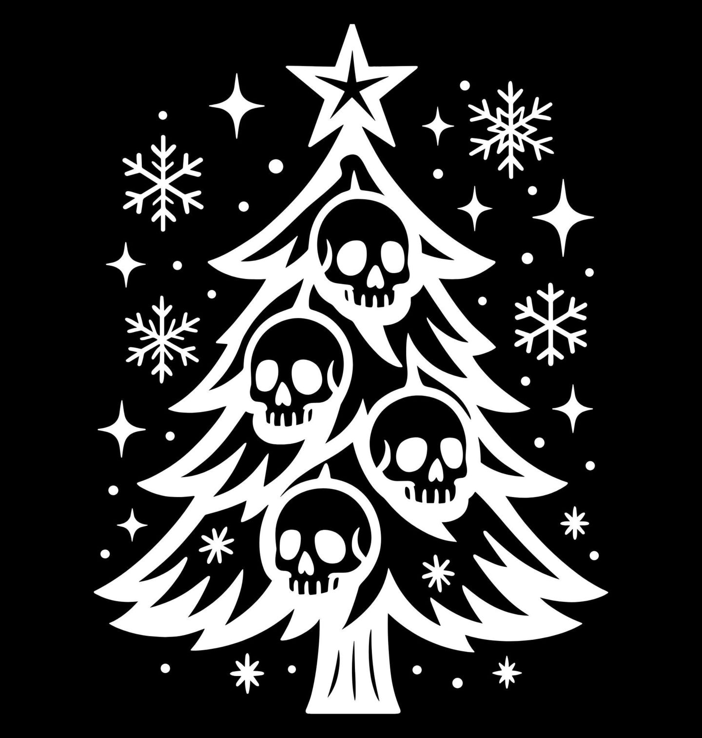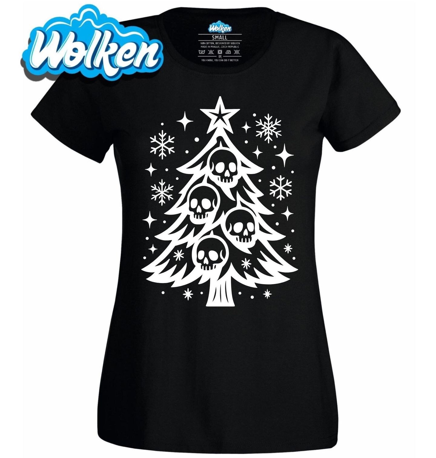 Dámské tričko Vánoční Stromek Ozdobený Lebkami. Design temného vánočního stromku ozdobeného lebkami je ideální volbou pro fanoušky goth, metal, horor nebo jednoduše netradičních stylů. Pokud chceš letos slavit Vánoce s pořádnou dávkou černého humoru, tohle triko je přesně pro tebe!
