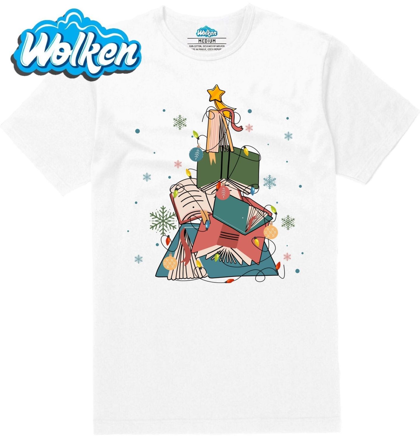 Pánské tričko Vánoční Stromek v Knihovně. Vánoce v knihovně? Proč ne! Stylový motiv „Vánoční Strom v Knihovně“ zobrazuje originální vánoční stromeček složený z otevřených i zavřených knih, omotaný barevnými světýlky, doplněný o vánoční ozdoby a sněhové vločky. Skvělý dárek pro milovníky čtení.