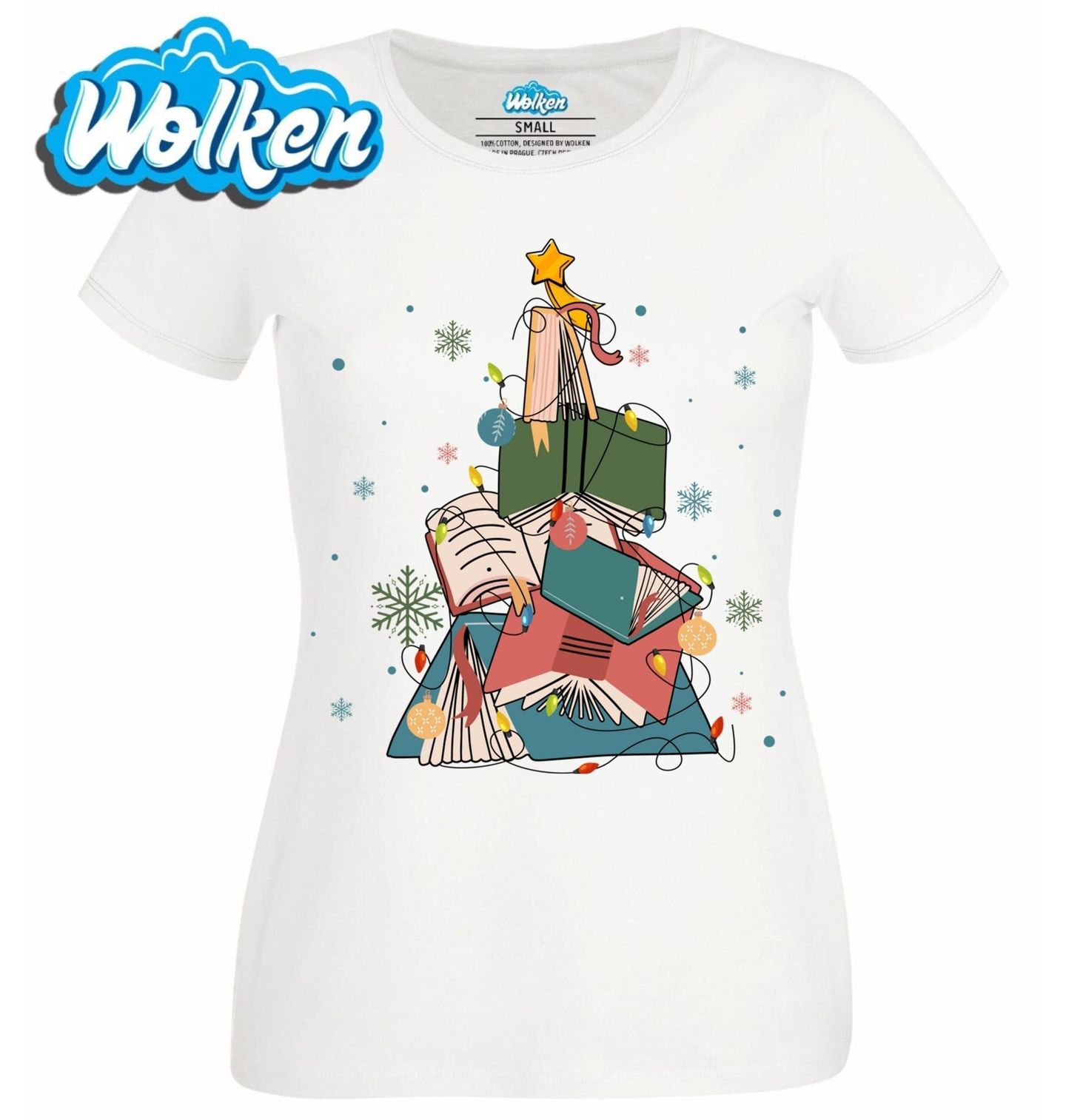 Dámské tričko Vánoční Stromek v Knihovně. Vánoce v knihovně? Proč ne! Stylový motiv „Vánoční Strom v Knihovně“ zobrazuje originální vánoční stromeček složený z otevřených i zavřených knih, omotaný barevnými světýlky, doplněný o vánoční ozdoby a sněhové vločky. Skvělý dárek pro milovníky čtení.