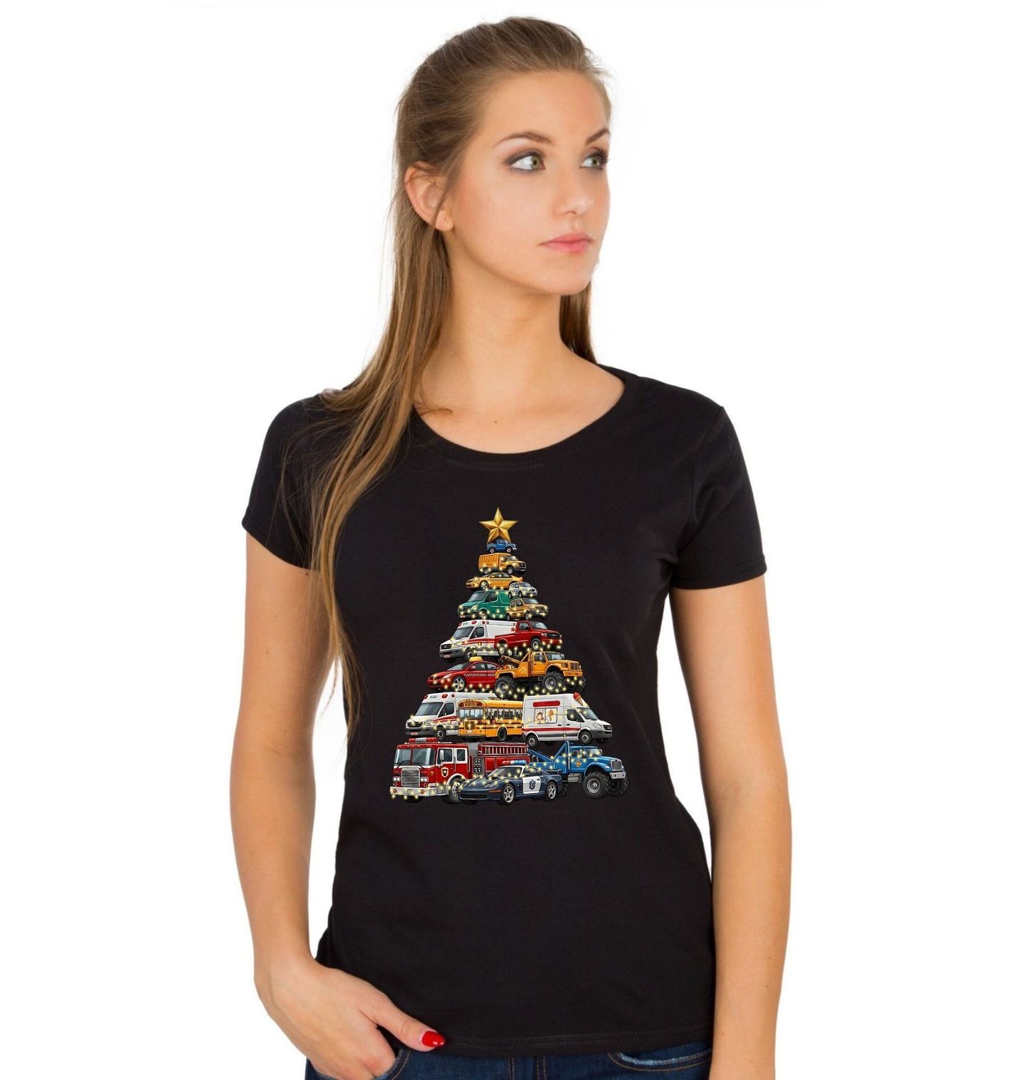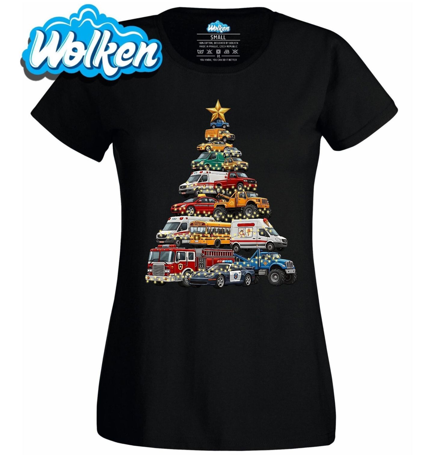 Dámské tričko Vánoční Stromek z Aut. Stylový vánoční stromeček poskládaný výhradně z různých druhů aut – od hasičského vozu přes sanitky, školní autobus až po taxi nebo policejní auto – je ideálním dárkem na Vánoce pro každého automobilového nadšence. Perfektní pro řidiče, mechaniky, milovníky aut i děti.