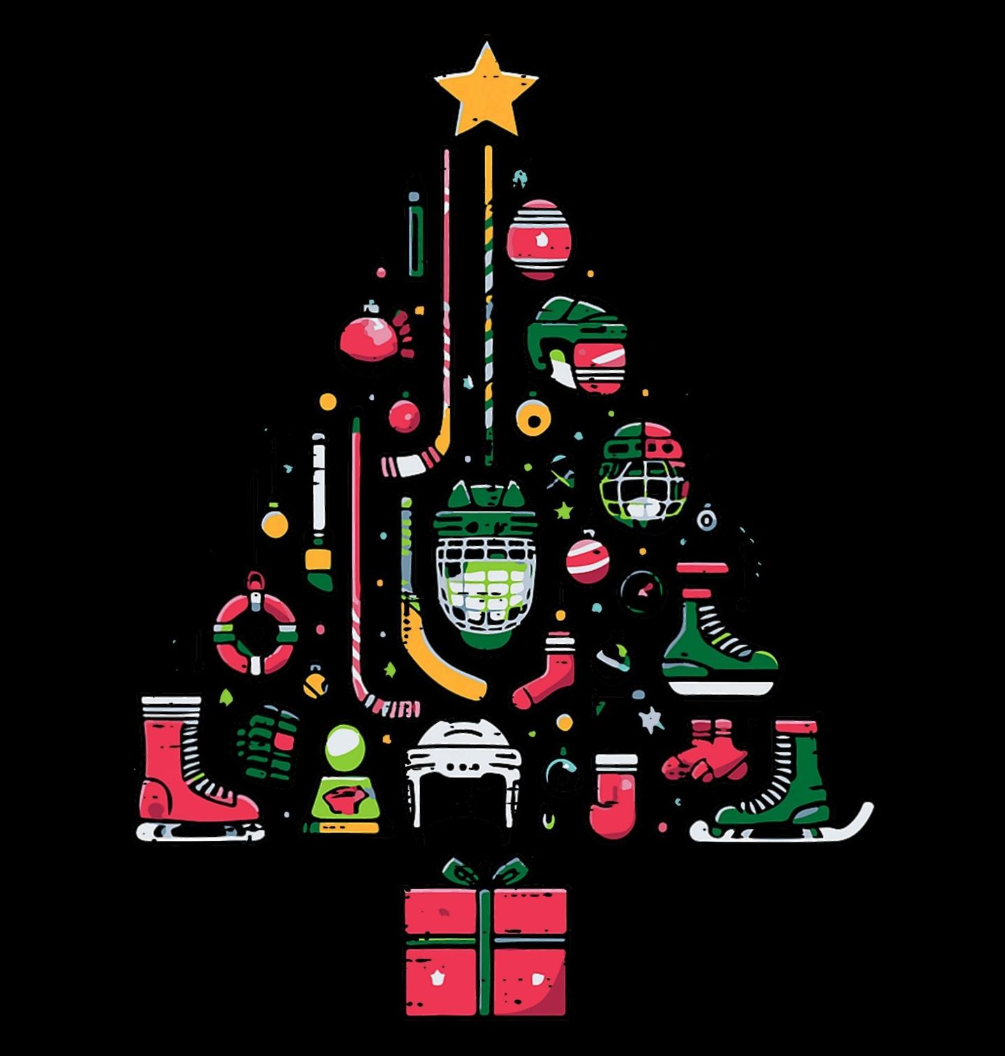 Dámské tričko Vánoční Stromek z Hokejové Výbavy. Spojte svou vášeň pro sport a sváteční atmosféru! Tento originální motiv zobrazuje vánoční stromek poskládaný z hokejové výbavy – brusle, helmy, hokejky, puky i rukavice. Ideální pro všechny fanoušky ledové arény, kteří chtějí ukázat, že pro ně Vánoce a hokej patří neodmyslitelně k sobě.