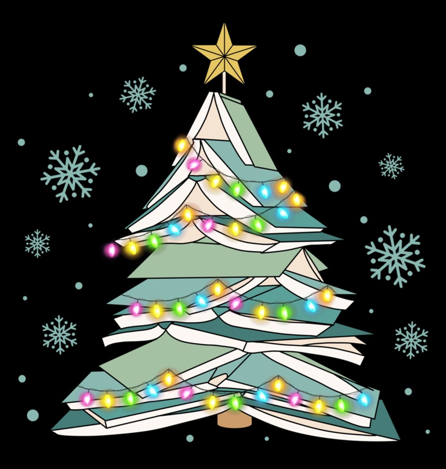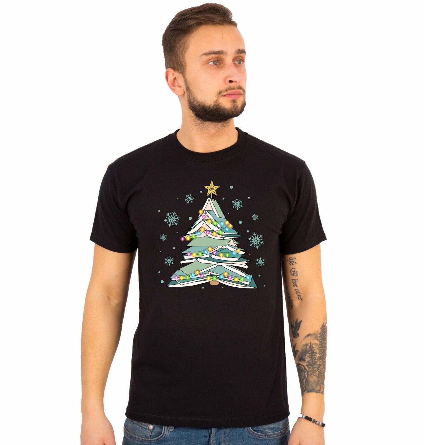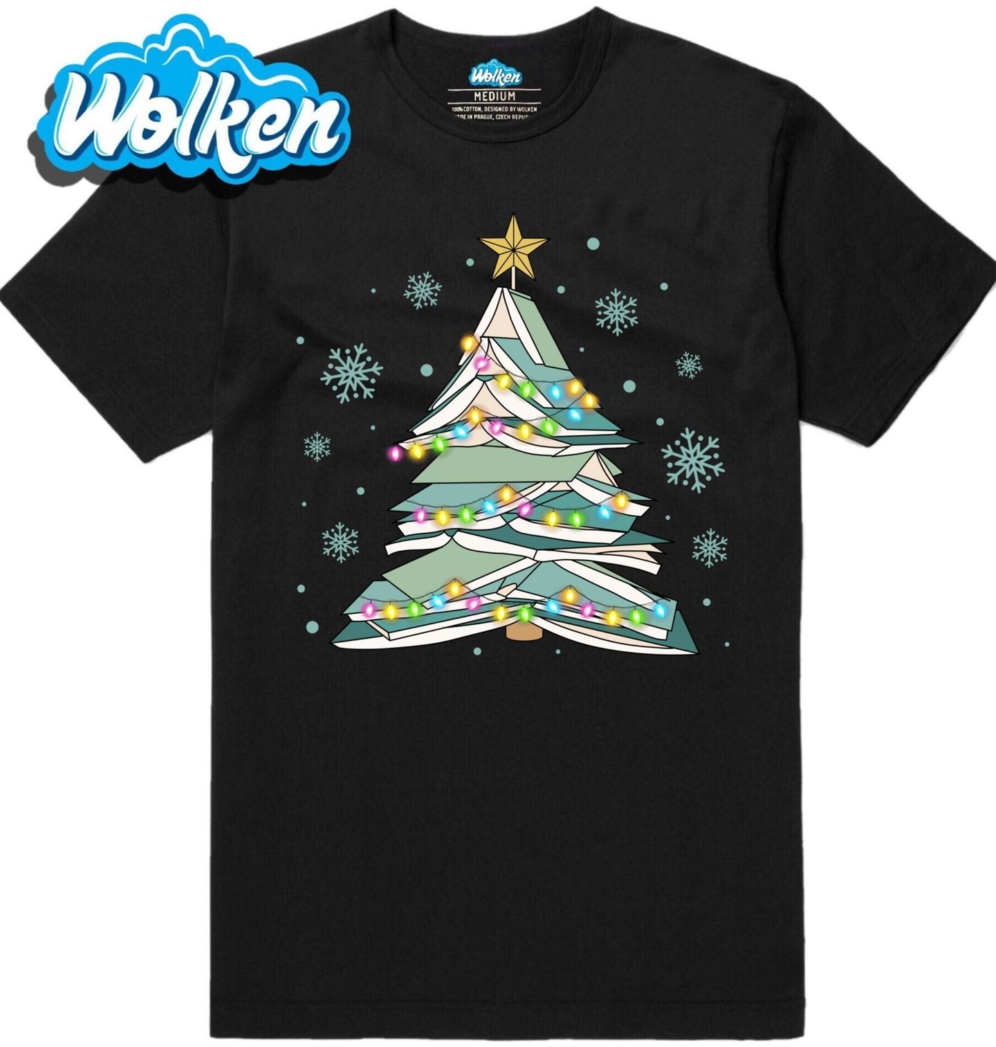 Pánské tričko Vánoční Stromek z Knih. Vánoční motiv, který ocení každý milovník čtení! Vánoční stromeček je zde kreativně sestaven z otevřených knih a ozdobený barevnými světýlky a hvězdou na vrcholu. Okolo stromečku padají jemné sněhové vločky.