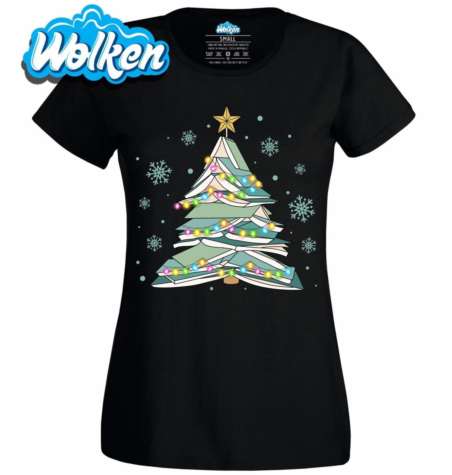 Dámské tričko Vánoční Stromek z Knih. Vánoční motiv, který ocení každý milovník čtení! Vánoční stromeček je zde kreativně sestaven z otevřených knih a ozdobený barevnými světýlky a hvězdou na vrcholu. Okolo stromečku padají jemné sněhové vločky.