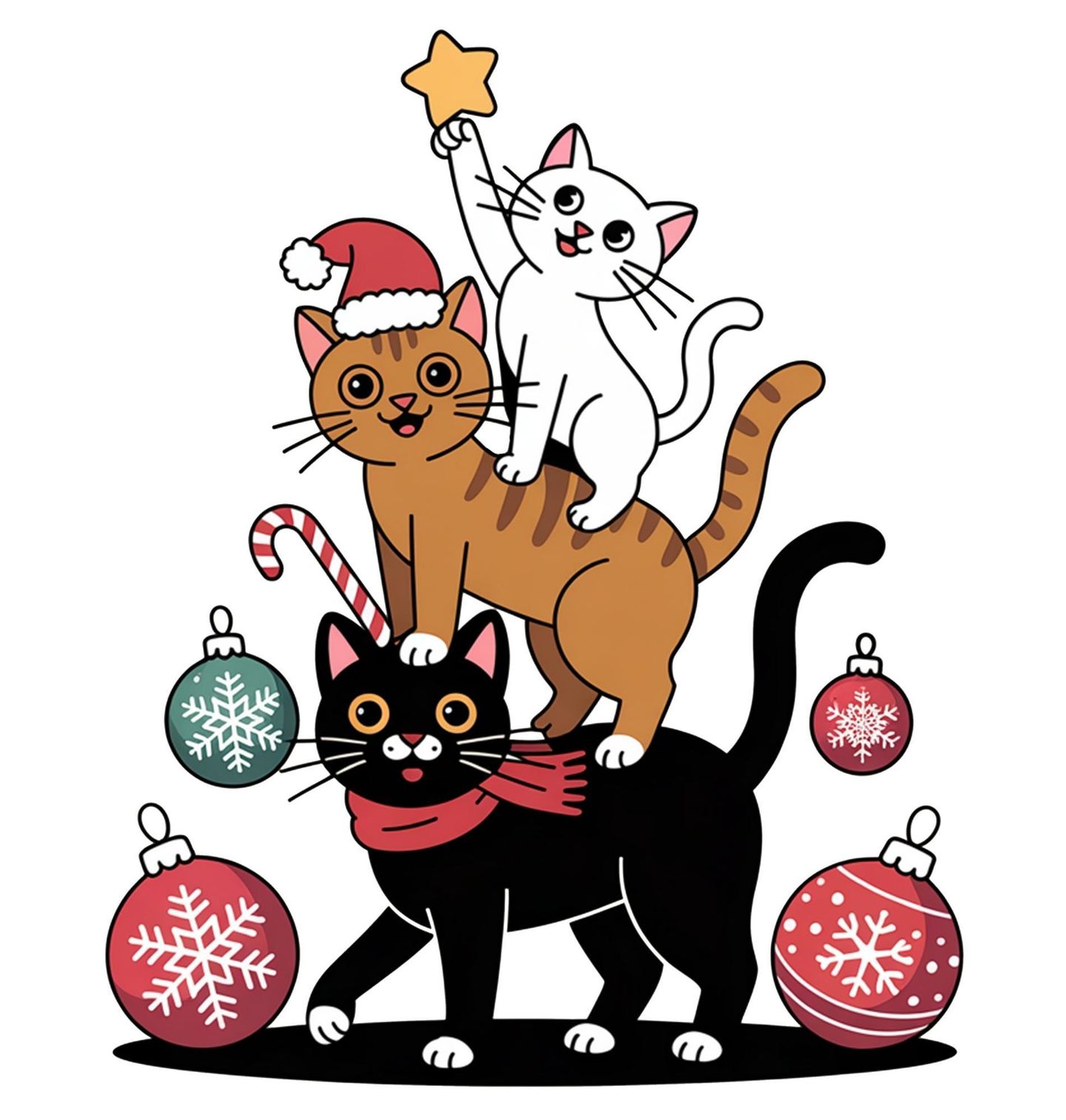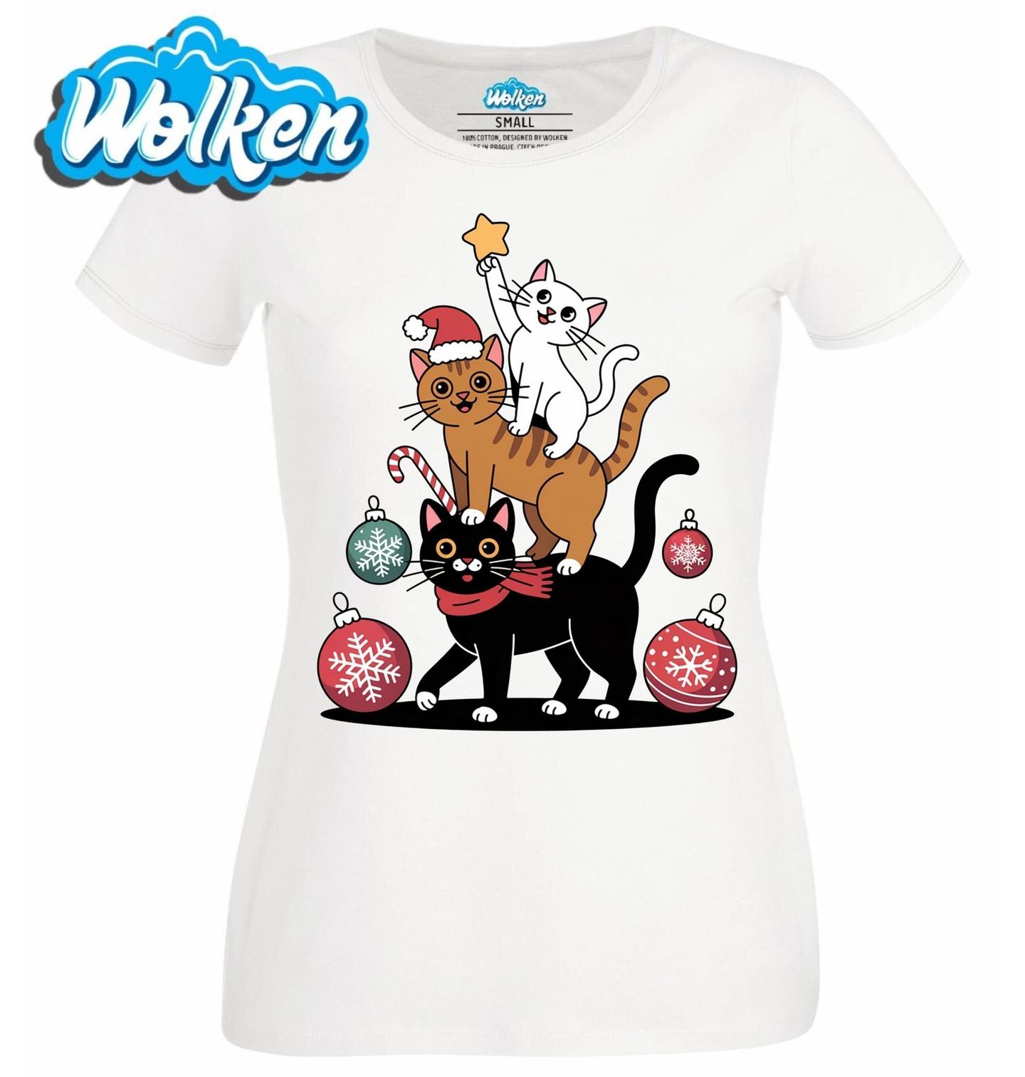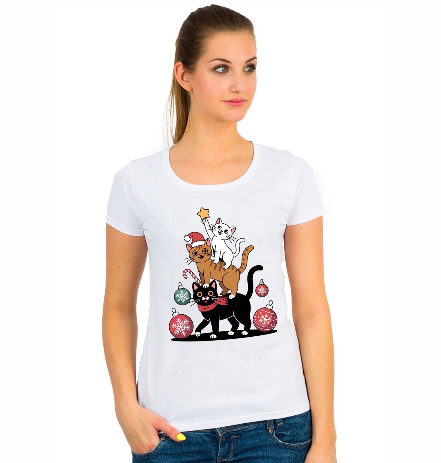 Dámské tričko Vánoční Stromek z Koček. Roztomilý vánoční motiv tří koček, které stojí jedna kočka na druhé, obklopené barevnými vánočními ozdobami. Ideální pro všechny milovníky koček a Vánoce. Tento design perfektně vystihuje radostnou atmosféru svátků s kočkou v hlavní roli.