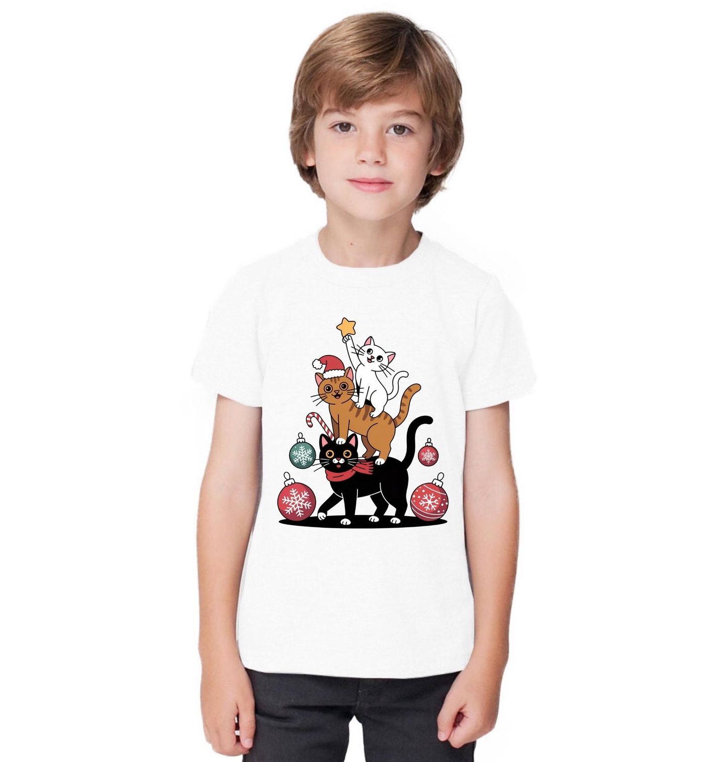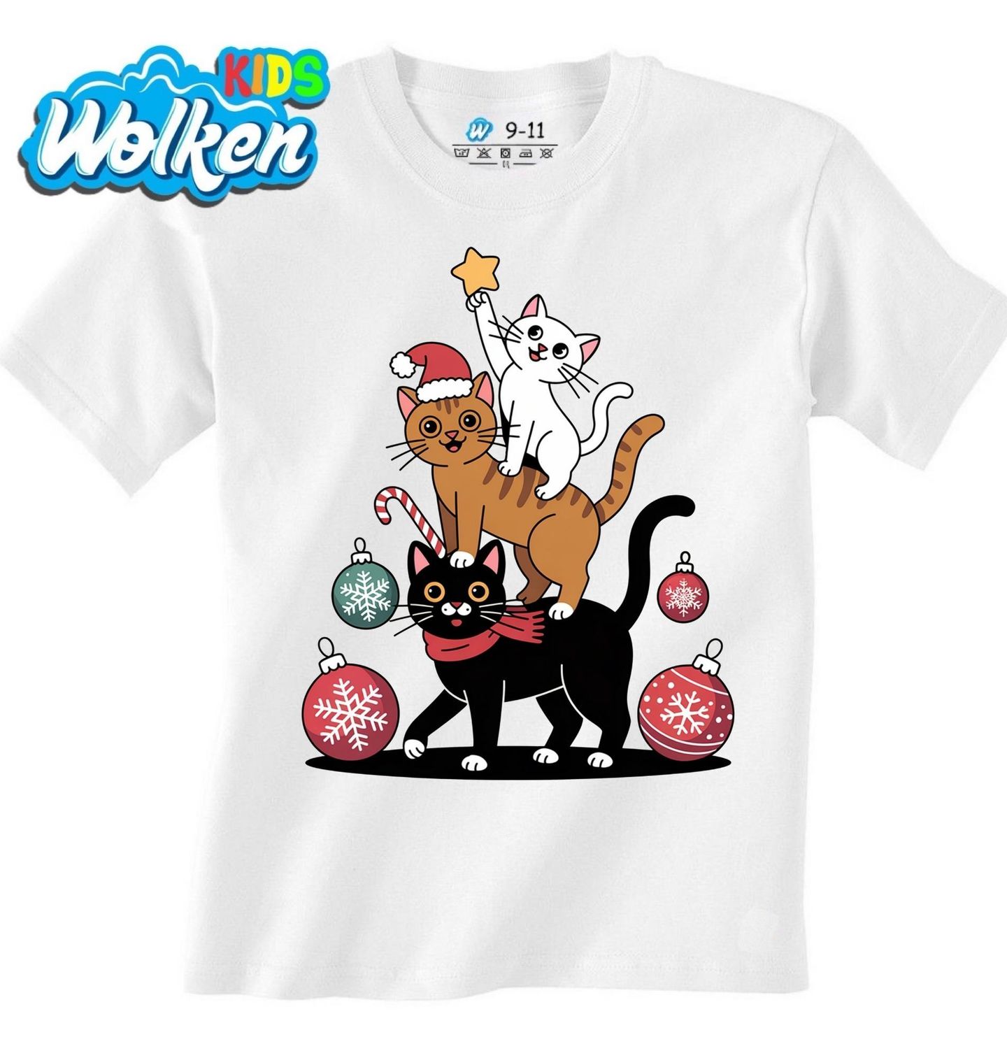 Dětské tričko Vánoční Stromek z Koček. Roztomilý vánoční motiv tří koček, které stojí jedna kočka na druhé, obklopené barevnými vánočními ozdobami. Ideální pro všechny milovníky koček a Vánoce. Tento design perfektně vystihuje radostnou atmosféru svátků s kočkou v hlavní roli.