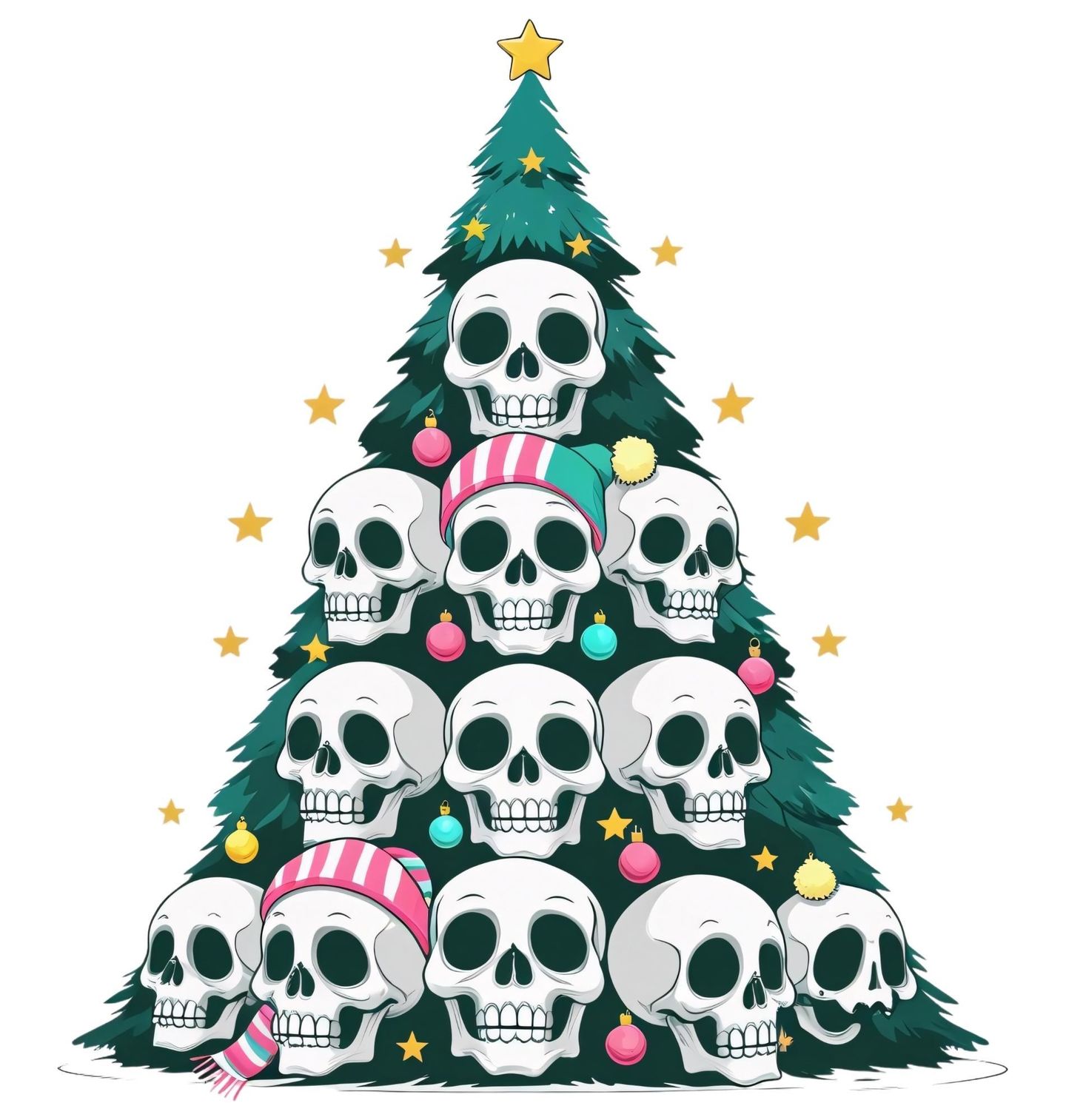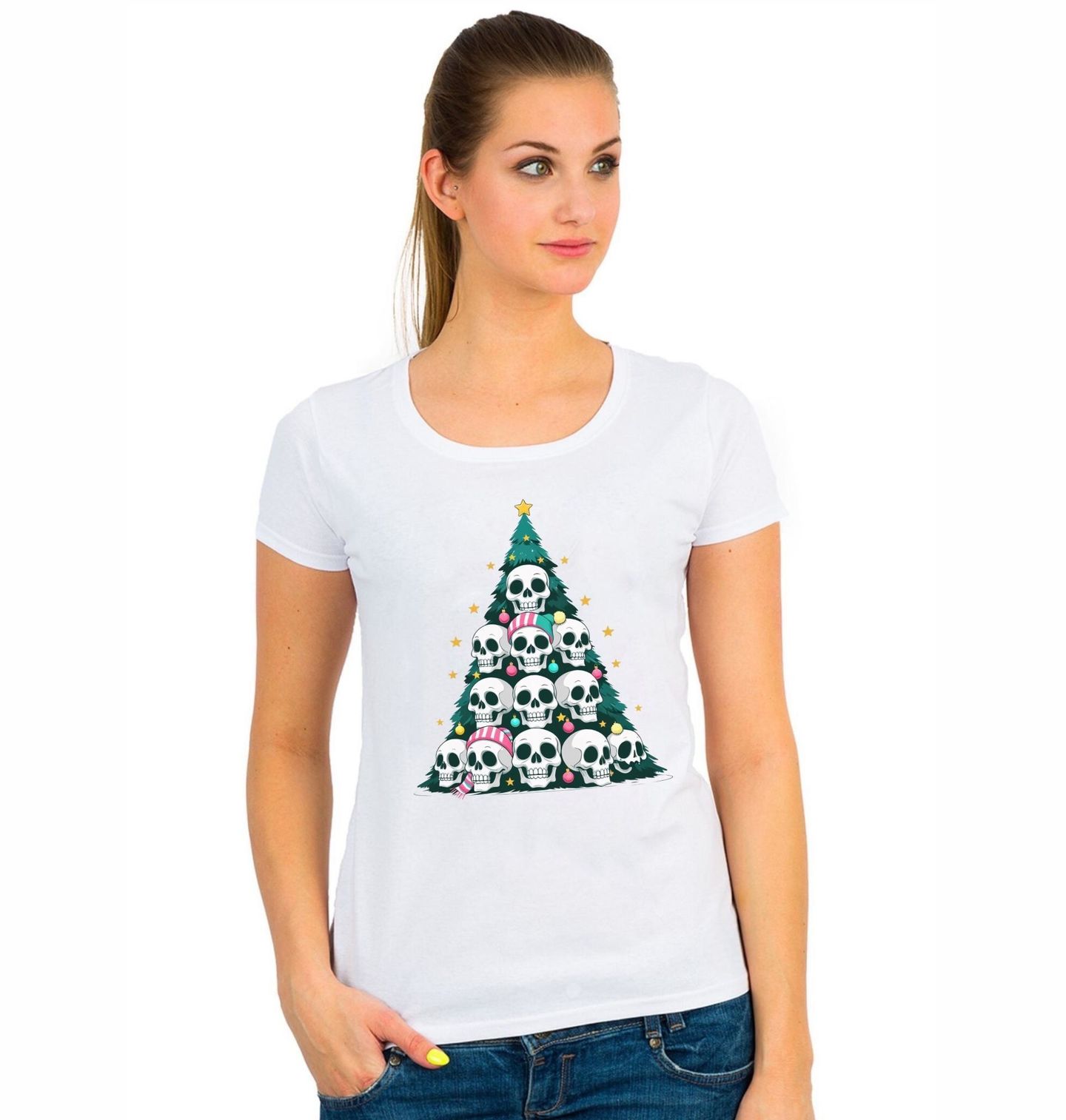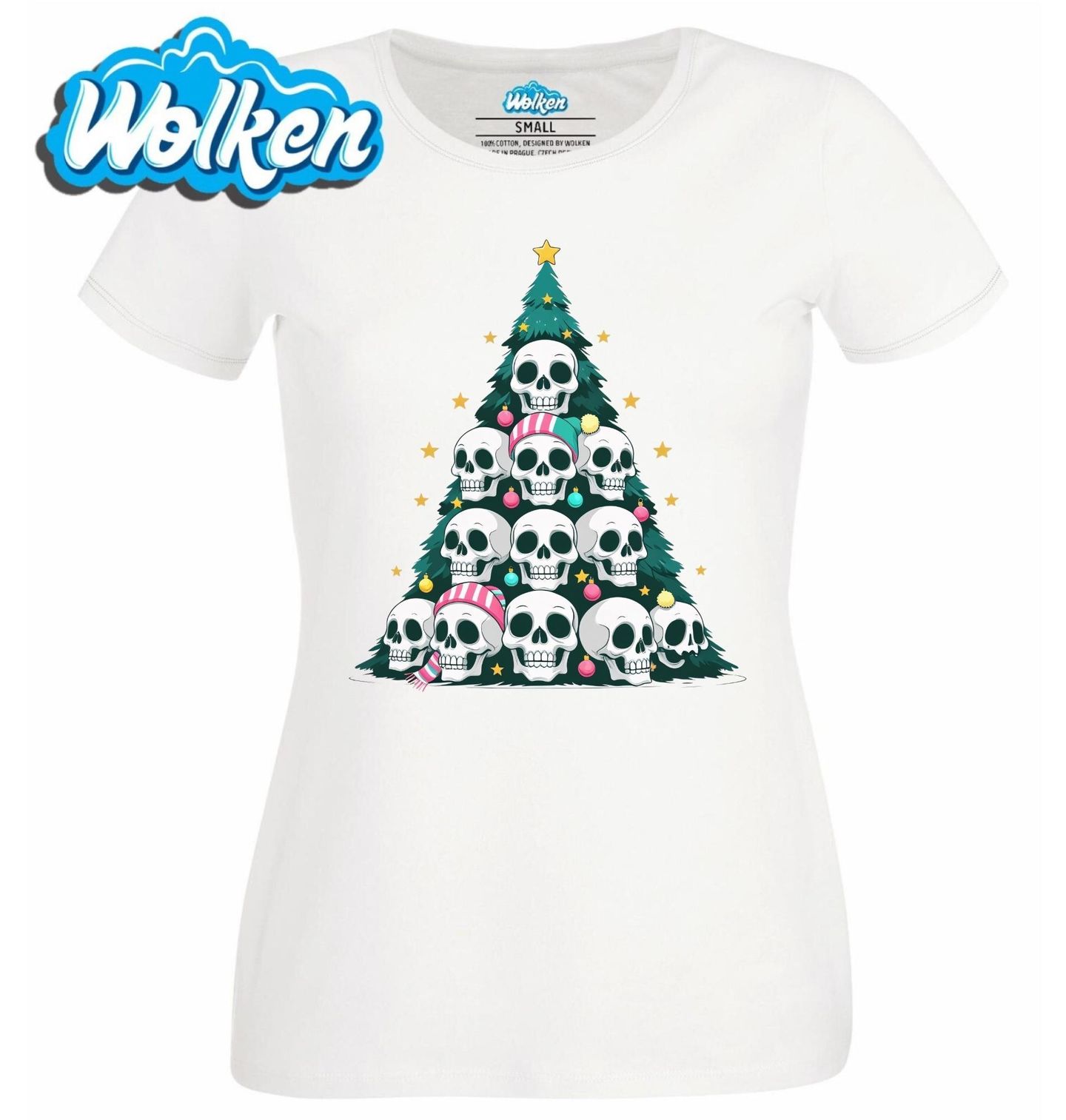 Dámské tričko Vánoční Stromek z Lebek. Tato vánoční jedlička je totiž místo ozdob vyzdobená pořádnou dávkou lebek – některé mají dokonce kulichy a čepice! Pokud chceš slavit Vánoce po svém a dát okolí jasně najevo, že nejsi fanoušek tradičních sobíků a cukroví, tohle tričko je must-have. Vhodné i jako netradiční outfit na vánoční večírek!