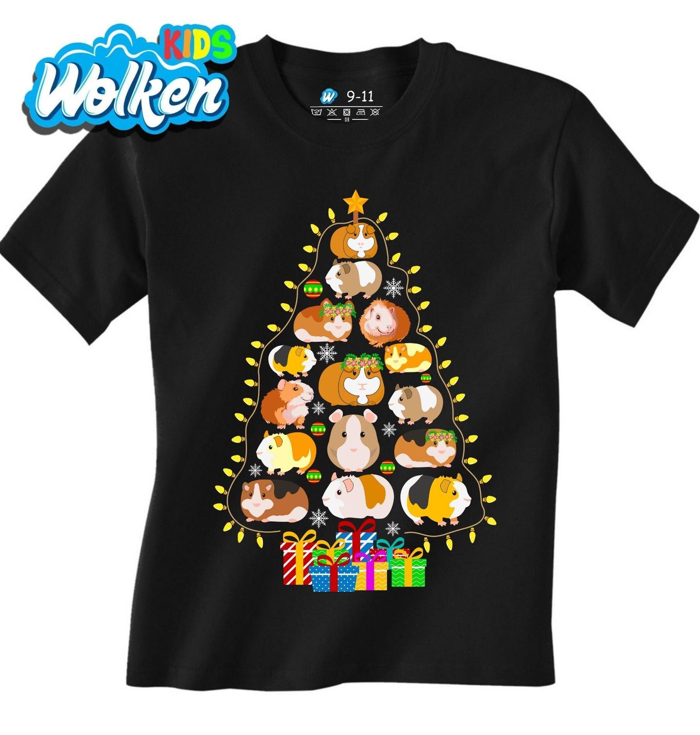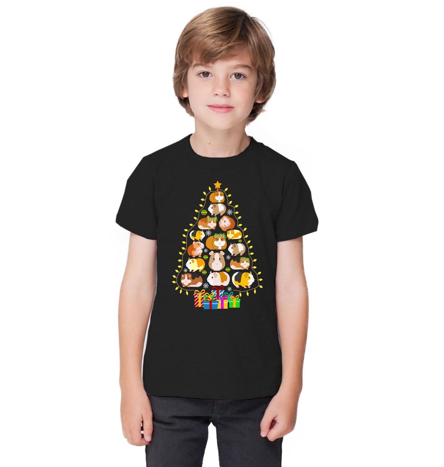 Dětské tričko Vánoční Stromek z Morčat. Každé morče je jako ozdoba na stromečku. Roztomilý vánoční motiv pro všechny milovníky morčat! Tato originální ilustrace zobrazuje vánoční stromeček složený z veselých morčat, doplněný o světýlka, sněhové vločky a dárky. Vánoce s morčetem nikdy nebyly stylovější!