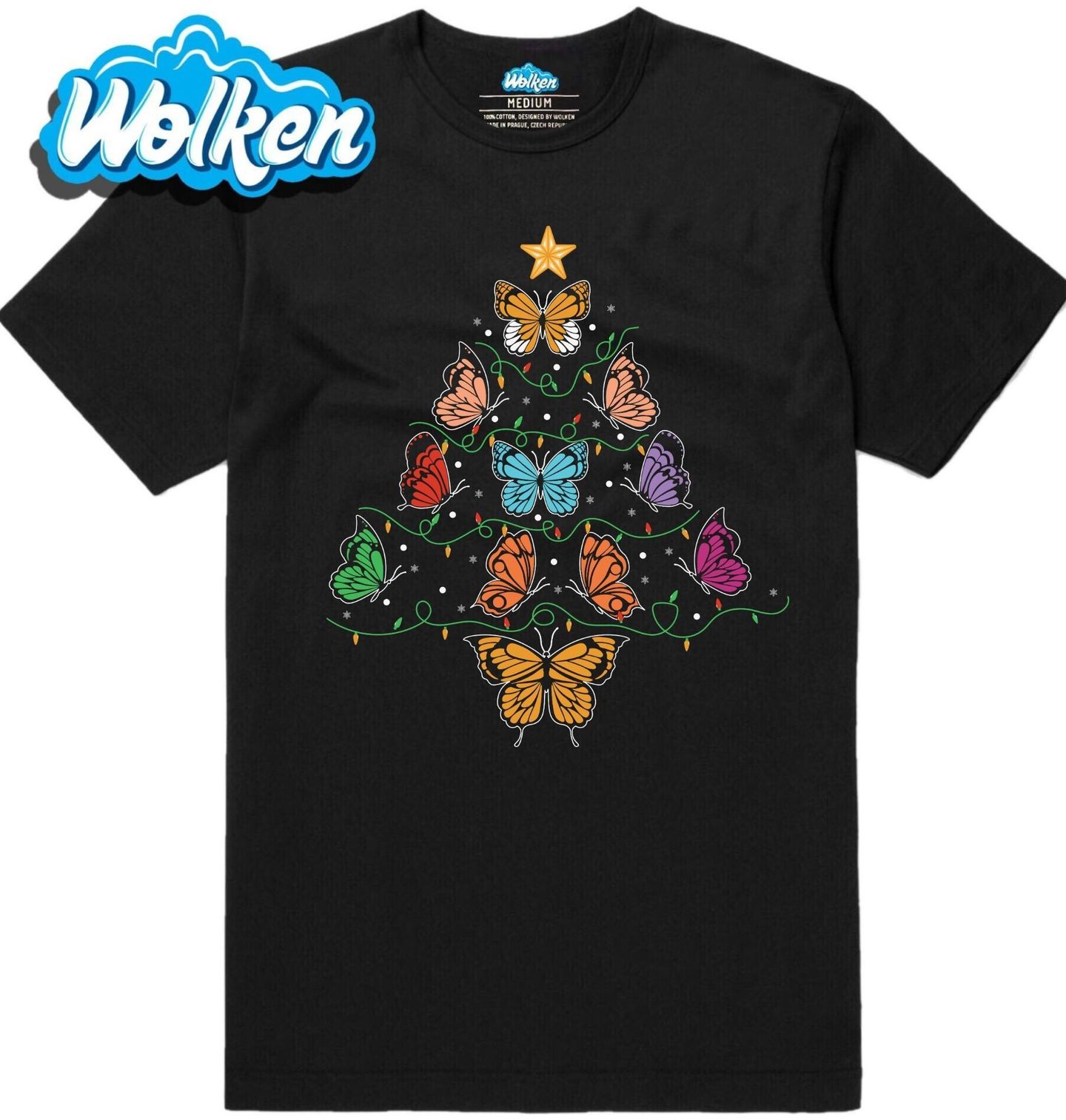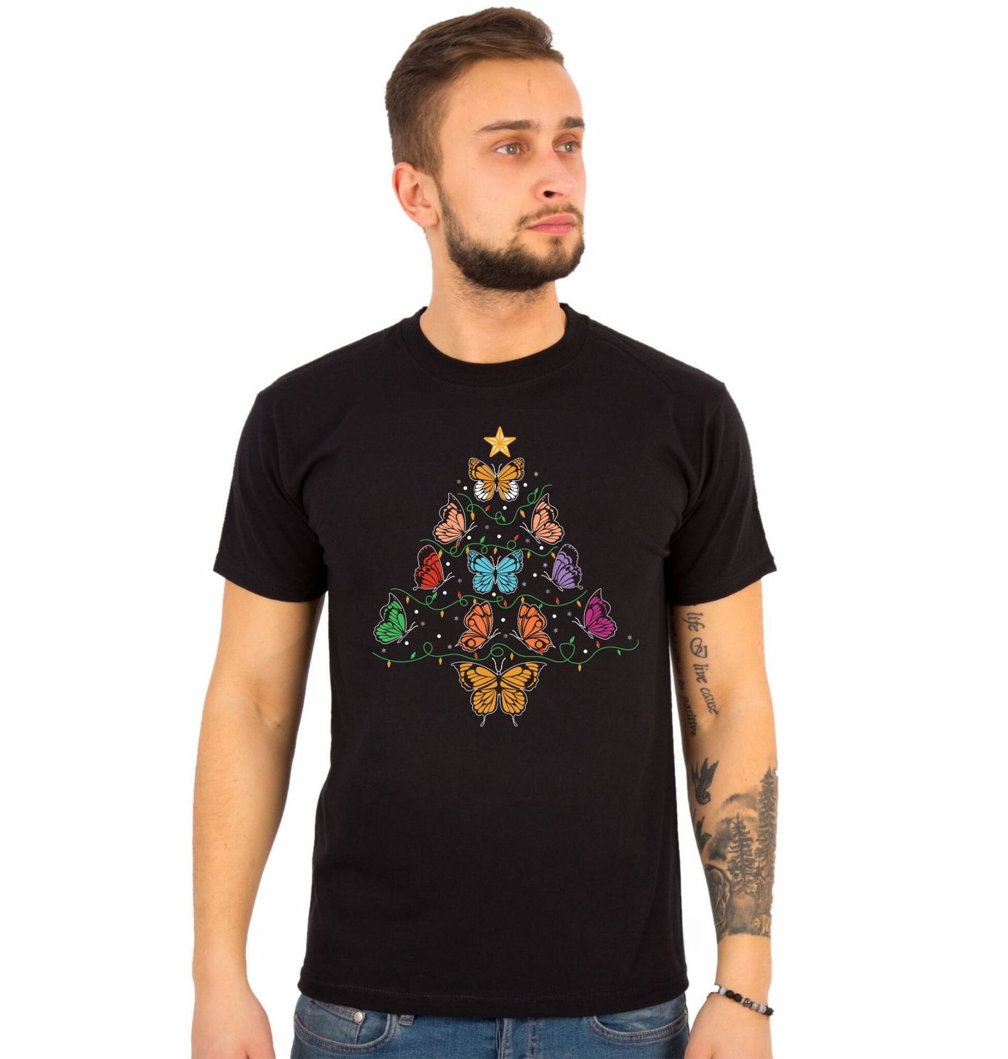 Pánské tričko Vánoční Stromek z Motýlů. Vánoce mohou být i jemné, lehké a poetické – přesně jako tento kouzelný motiv vánočního stromku složeného z barevných motýlů. Motýlí křídla vytvářejí tvar stromečku, který je ozdoben světýlky a zakončen zlatou hvězdou.