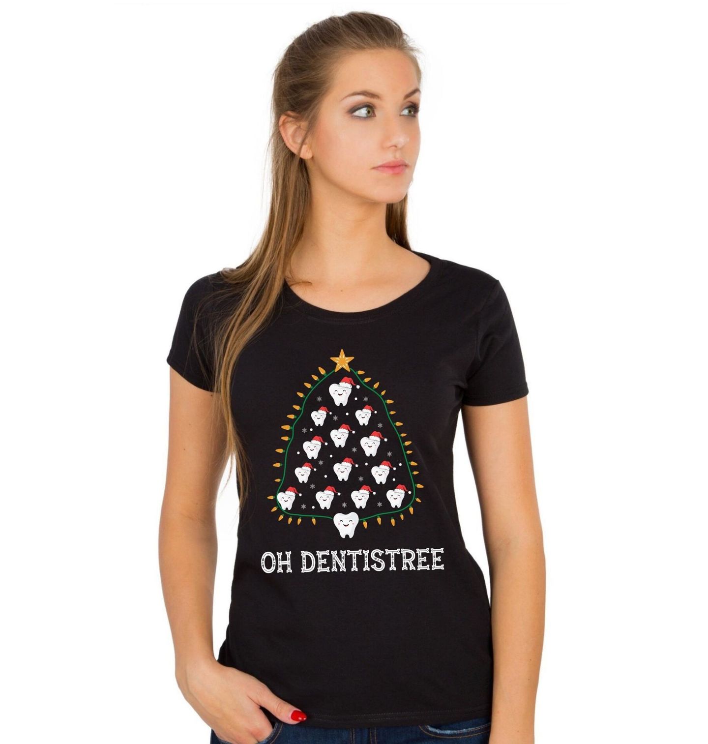 Dámské tričko Vánoční Stromek ze Stoliček Oh DentisTree. Originální a hravý design pro každého zubaře či zubařku! Tento vánoční motiv „Oh DentisTree“ kombinuje klasický vánoční stromeček se spoustou usměvavých zoubků v čepicích Santa Clause – symbol péče o chrup i sváteční nálady. Vánoce mohou být veselé a zároveň profesní!