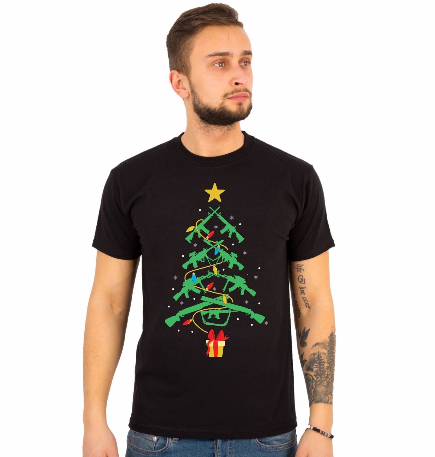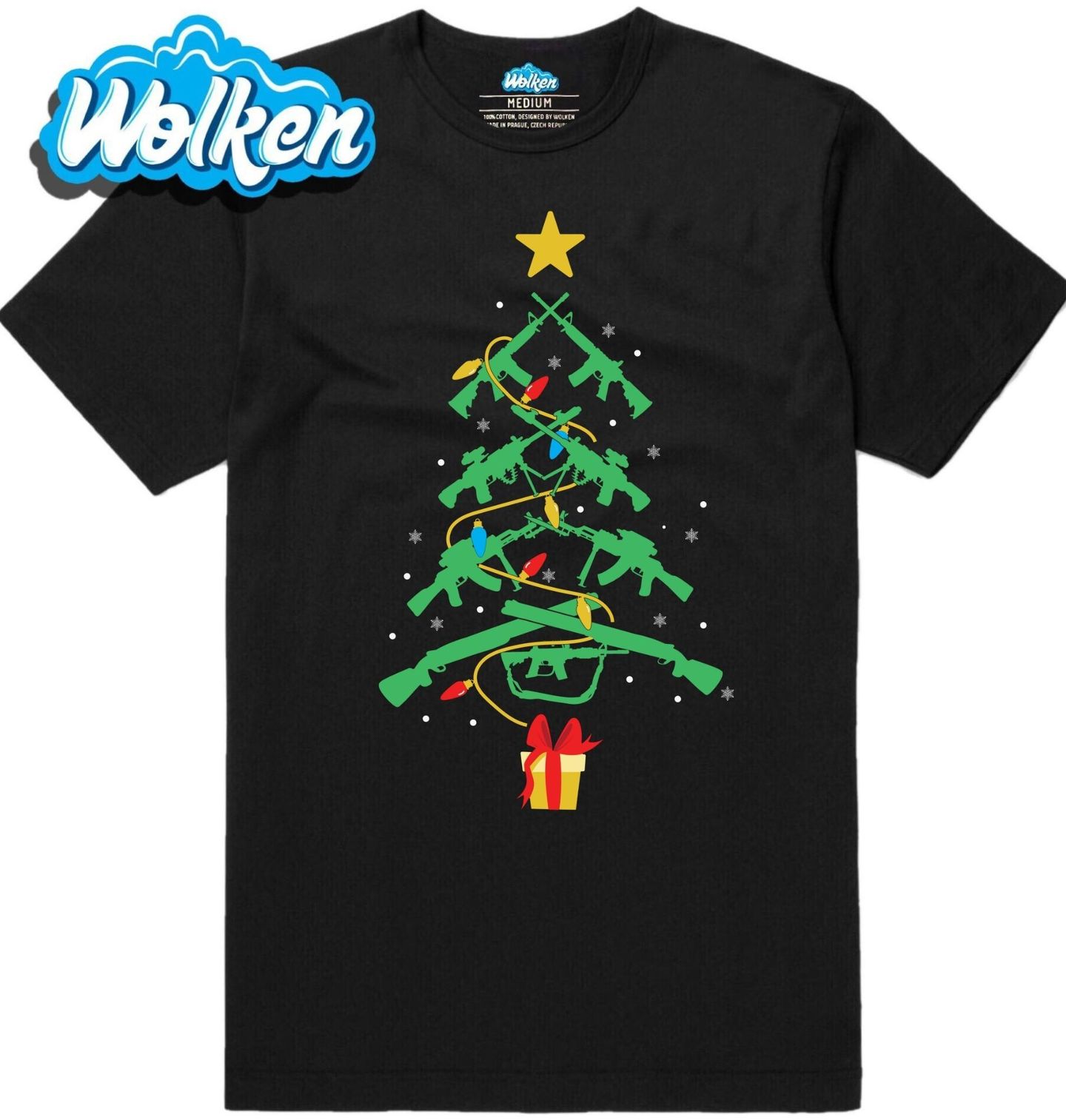 Pánské tričko Vánoční Stromek ze Zbraní. Vánoce mohou být stylové i pro milovníky zbraní, military stylu nebo střelby! Tento netradiční motiv vánočního stromečku složeného ze siluet pušek, samopalů a brokovnic je ideální pro každého, kdo slaví svátky se smyslem pro černý humor nebo vášeň pro zbrojní tématiku.