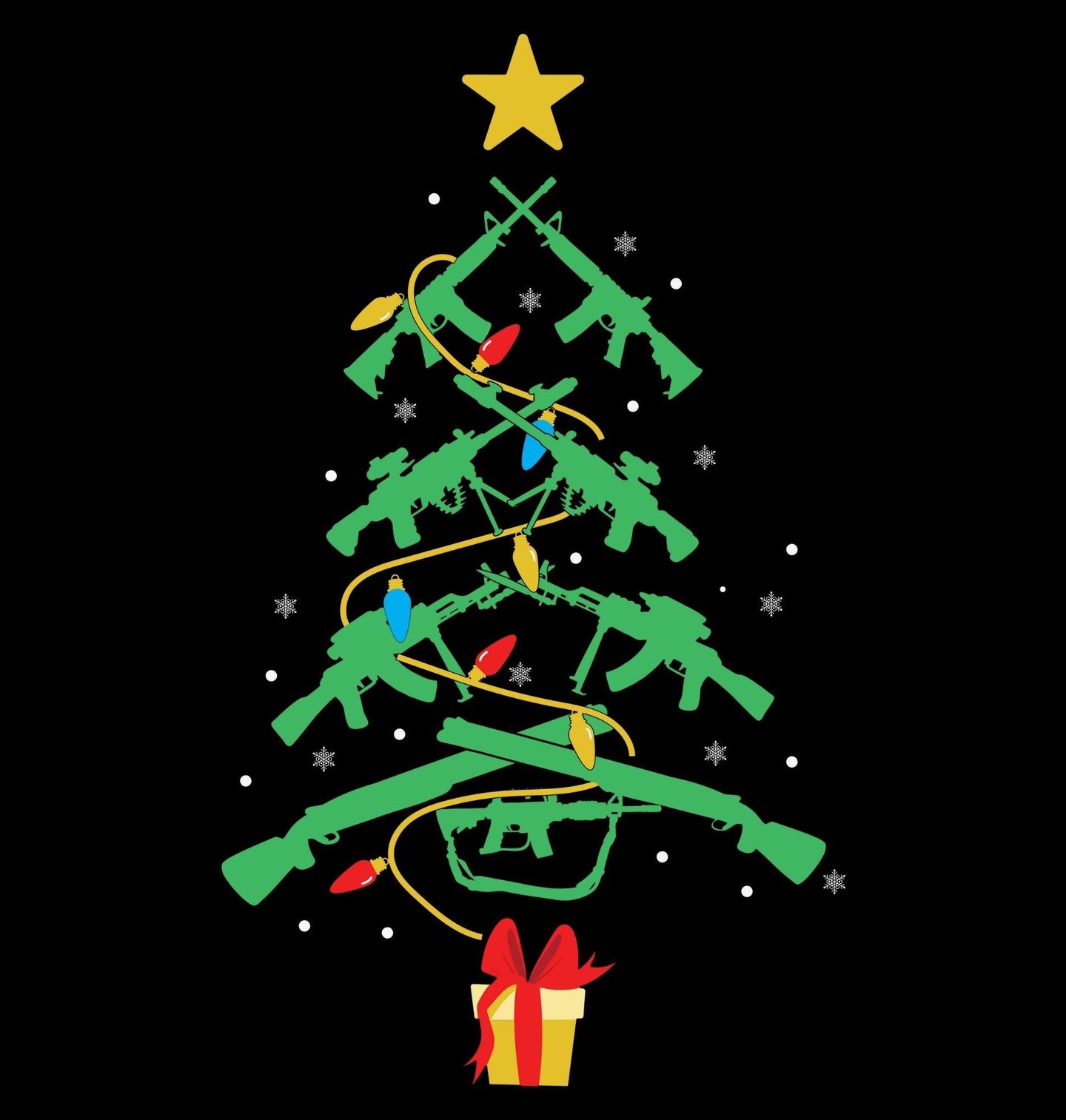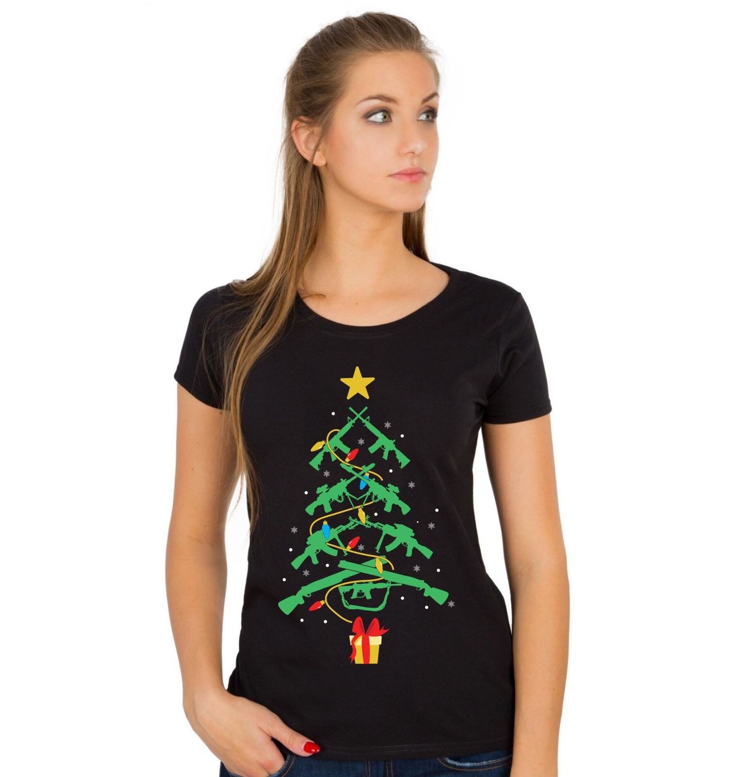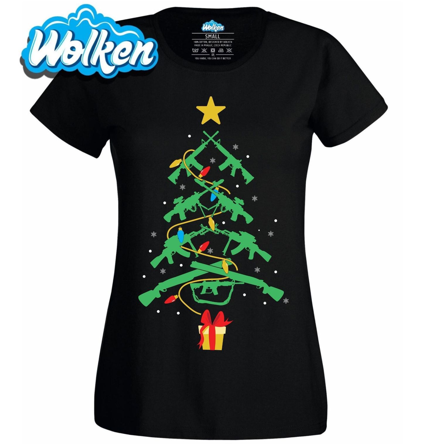 Dámské tričko Vánoční Stromek ze Zbraní. Vánoce mohou být stylové i pro milovníky zbraní, military stylu nebo střelby! Tento netradiční motiv vánočního stromečku složeného ze siluet pušek, samopalů a brokovnic je ideální pro každého, kdo slaví svátky se smyslem pro černý humor nebo vášeň pro zbrojní tématiku.