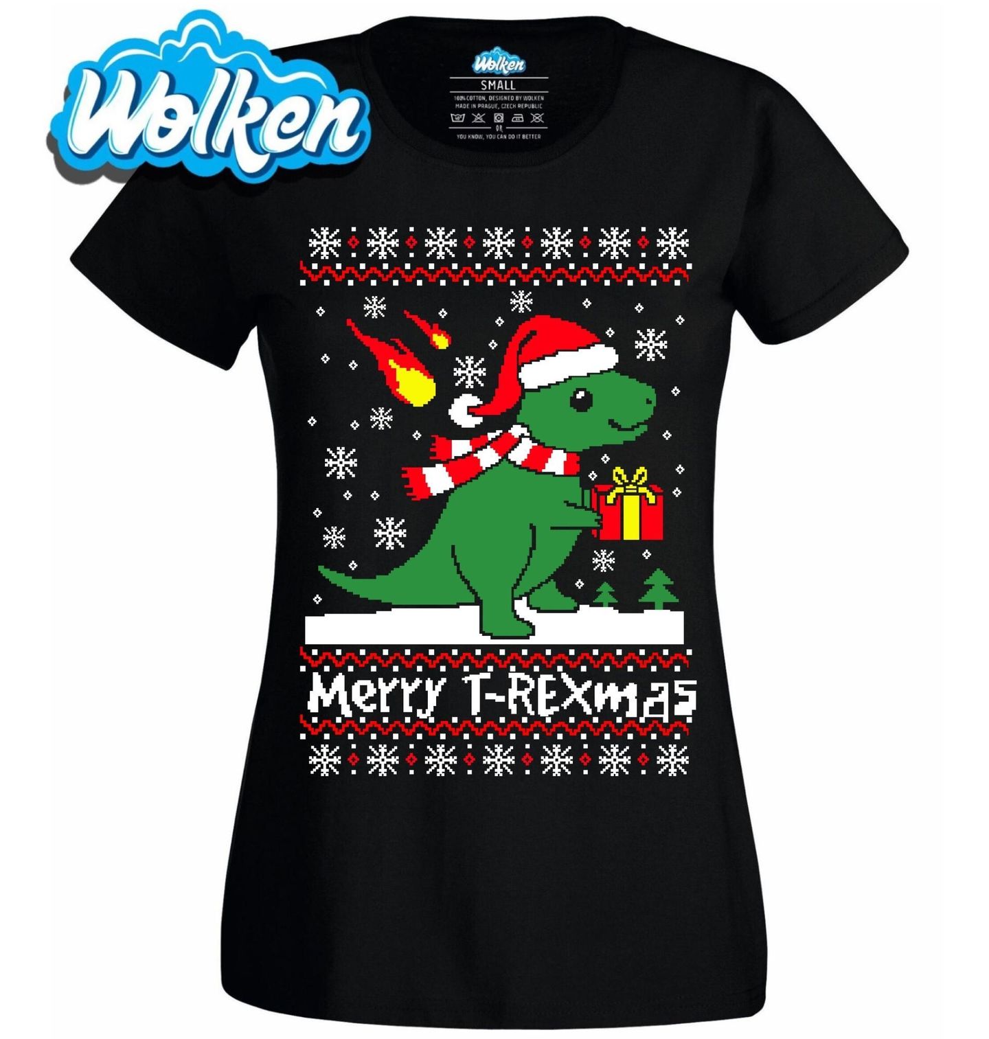 Dámské tričko Vánoční T-Rex Merry T-Rexmas. Tento vtipný ugly sweater a roztomilý dinosaurus T-Rex v čepici, šále a s vánočním dárkem v ruce ti zaručí pozornost na každé vánoční párty. Nechybí ani komety padající z nebe – klasika pro pořádné Vánoce s humorem.