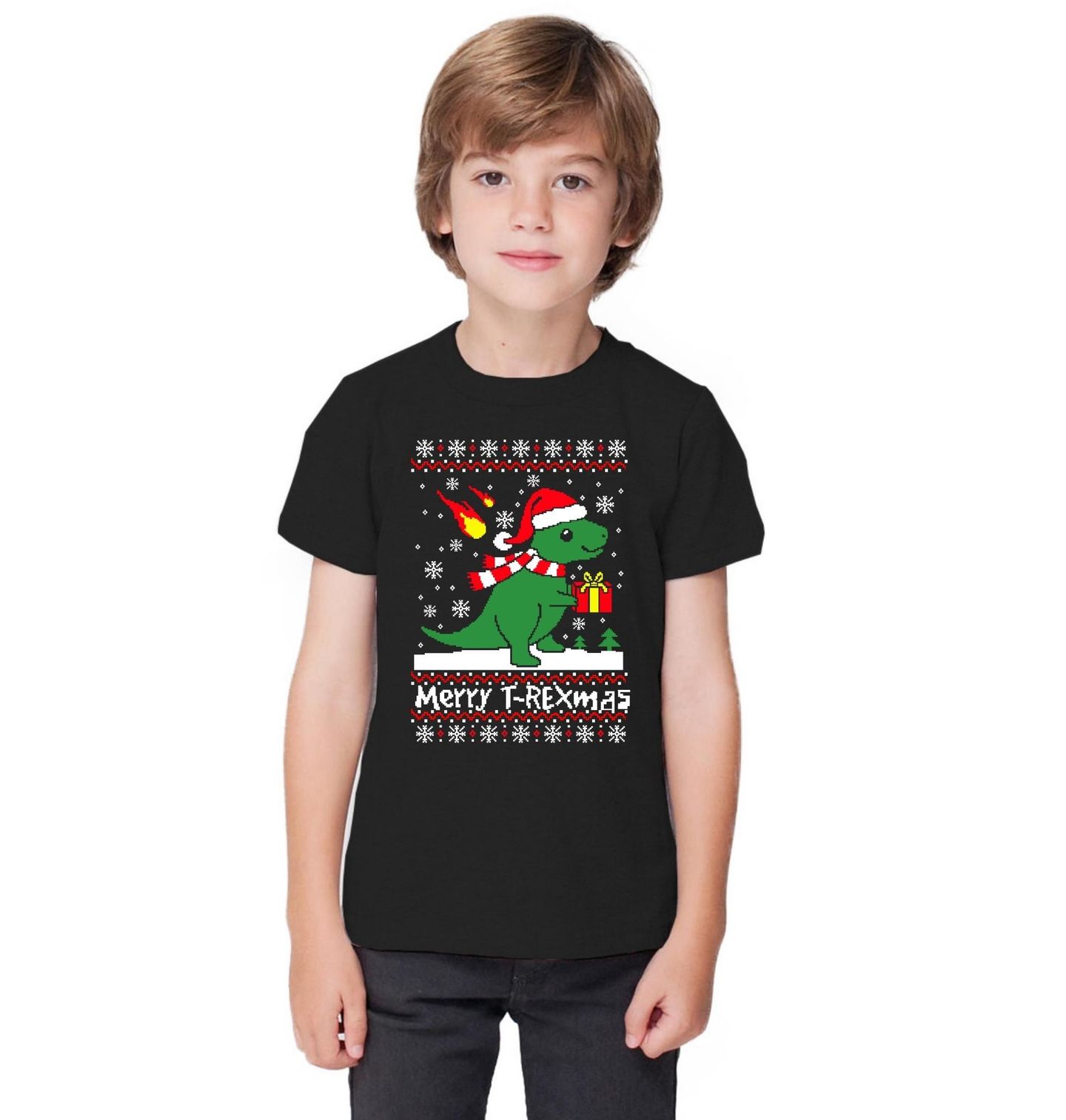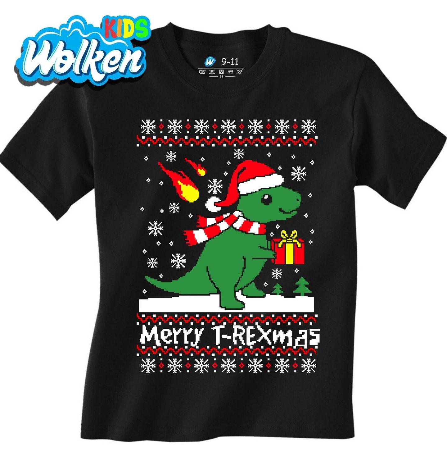 Dětské tričko Vánoční T-Rex Merry T-Rexmas. Tento vtipný ugly sweater a roztomilý dinosaurus T-Rex v čepici, šále a s vánočním dárkem v ruce ti zaručí pozornost na každé vánoční párty. Nechybí ani komety padající z nebe – klasika pro pořádné Vánoce s humorem.