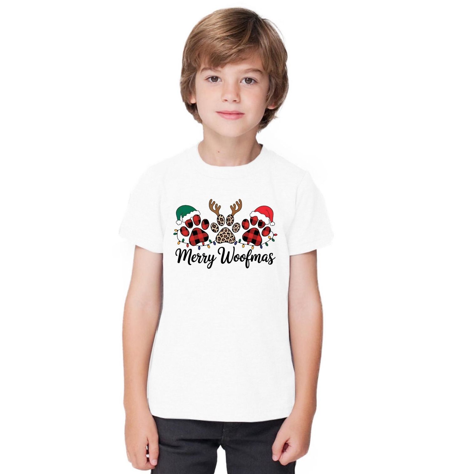 Dětské tričko Vánoční Tlapky Merry Woofmas. Rozkošný vánoční motiv Veselé Psí Vánoce potěší každého pejskaře, který chce během Vánoc ukázat, že pes je jeho nejlepší přítel. Tři veselé tlapky – s kostkovaným vzorem, leopardím motivem a vánočními čepicemi – jsou doplněné o sobí parůžky a světýlka, které vykouzlí úsměv každému pejskaři.