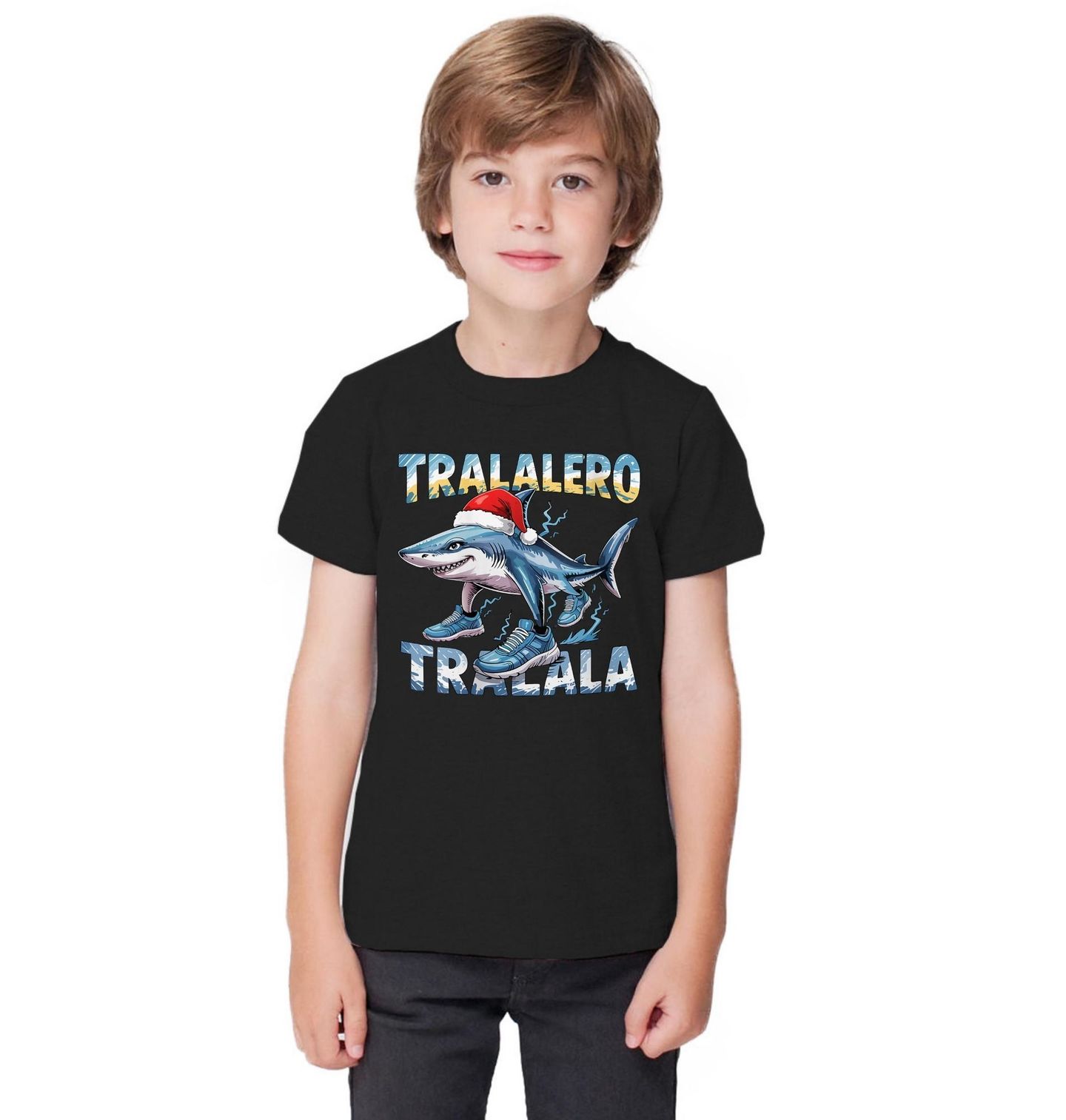 Dětské tričko Vánoční Tralalero Tralala. Připrav se na nejsvéráznější sváteční look – italský brainrot přichází ve formě vánočního žraloka v keckách! Ideální meme na Vánoce – pro ty, kdo se neberou moc vážně a tráví moc času na internetu.