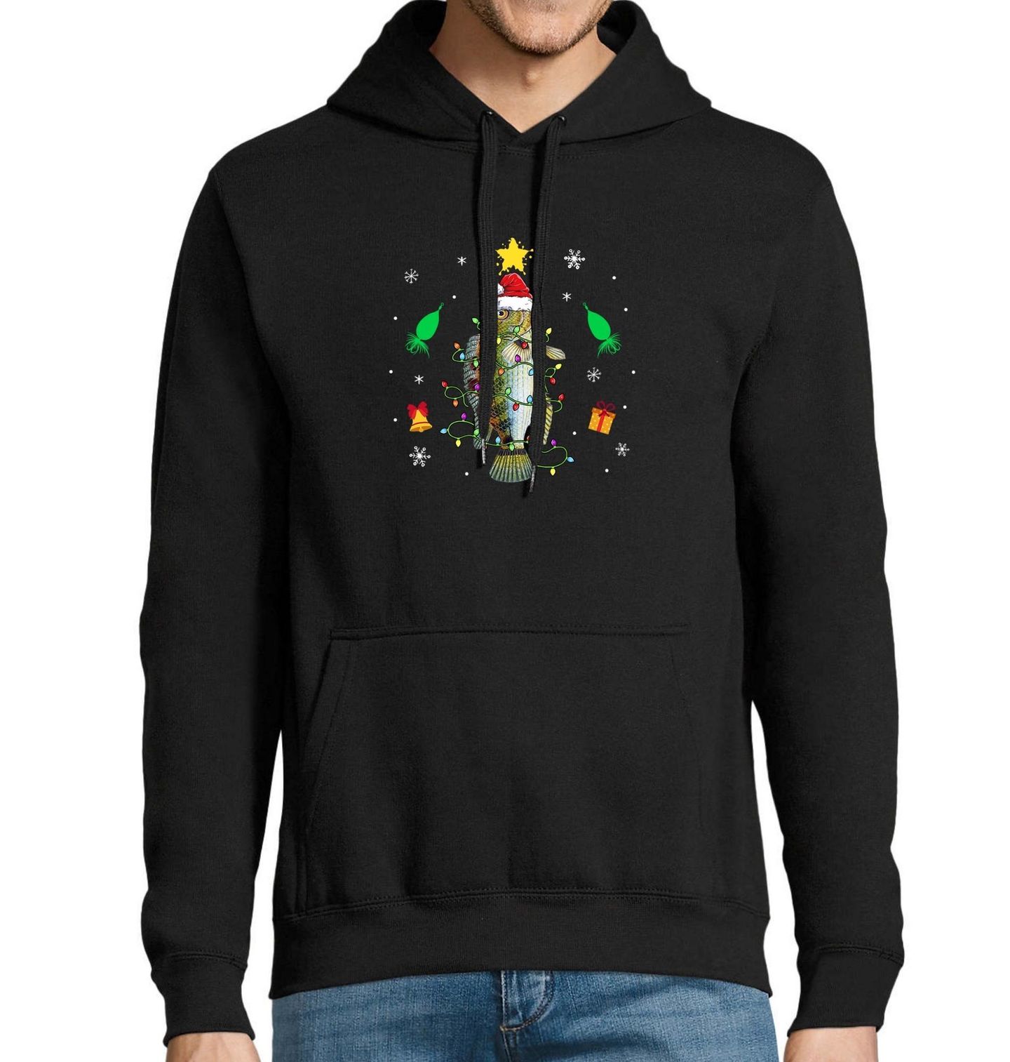 Pánská mikina Vánoční Trofej Rybáře. Vánoce jsou ideální čas ukázat svou lásku k rybaření a rybám! Tento veselý motiv s rybou okounkem v Santa čepici a obtočeným vánočním světelným řetězem potěší každého rybáře. Ryba okounek je oblíbená pro své krásné zbarvení a je symbolem rybaření na jezerech i řekách.