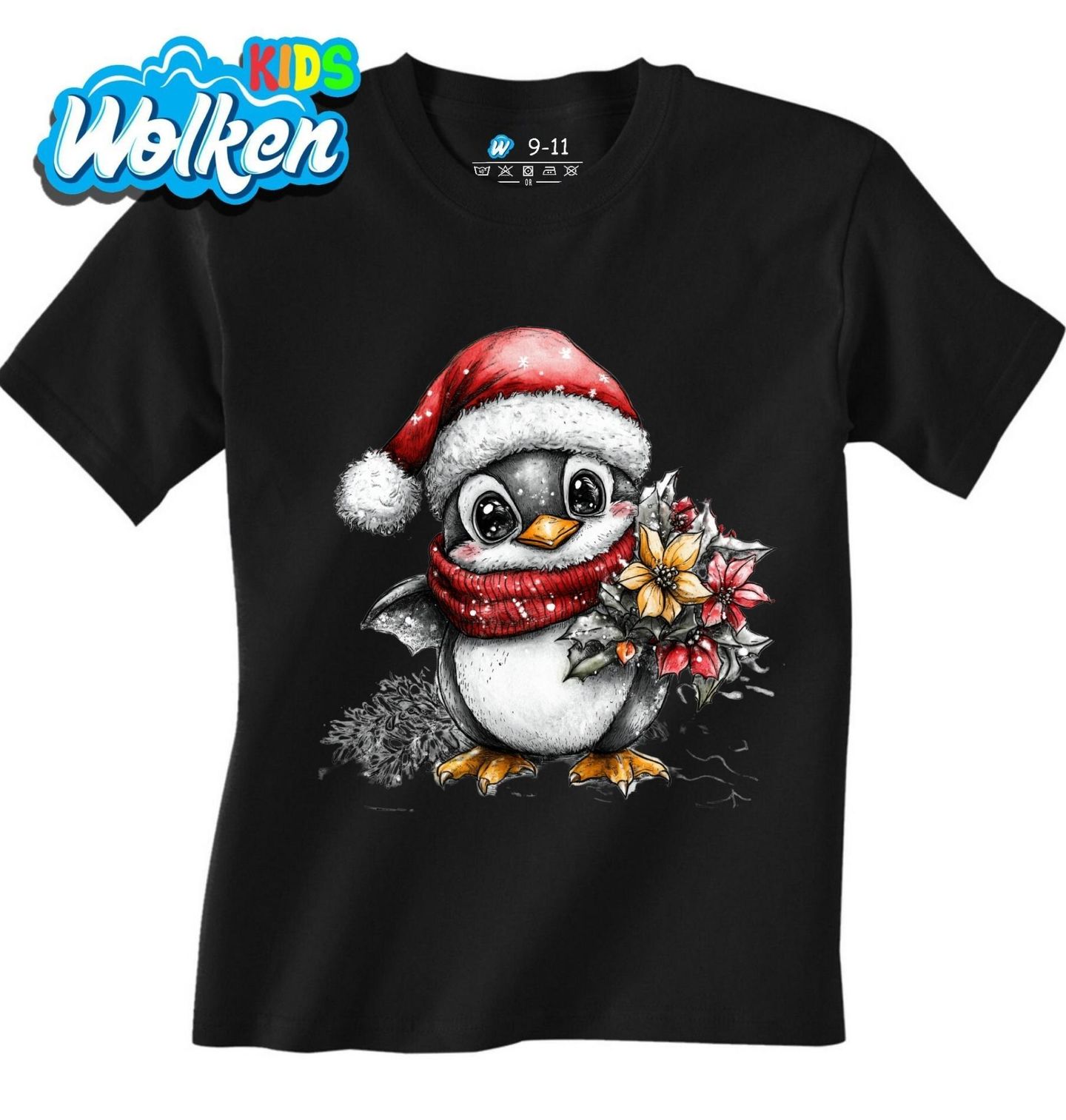 Dětské tričko Vánoční Tučňák s Květinou. Roztomilý motiv plný sváteční atmosféry! Stylový tučňák v červené čepici a šále drží Pryšec nádherný („vánoční hvězda“) a přináší radost a pohodu do každého domova. Ideální pro všechny, kdo milují Vánoce, zimní pohádky a roztomilého každého pták s osobností.