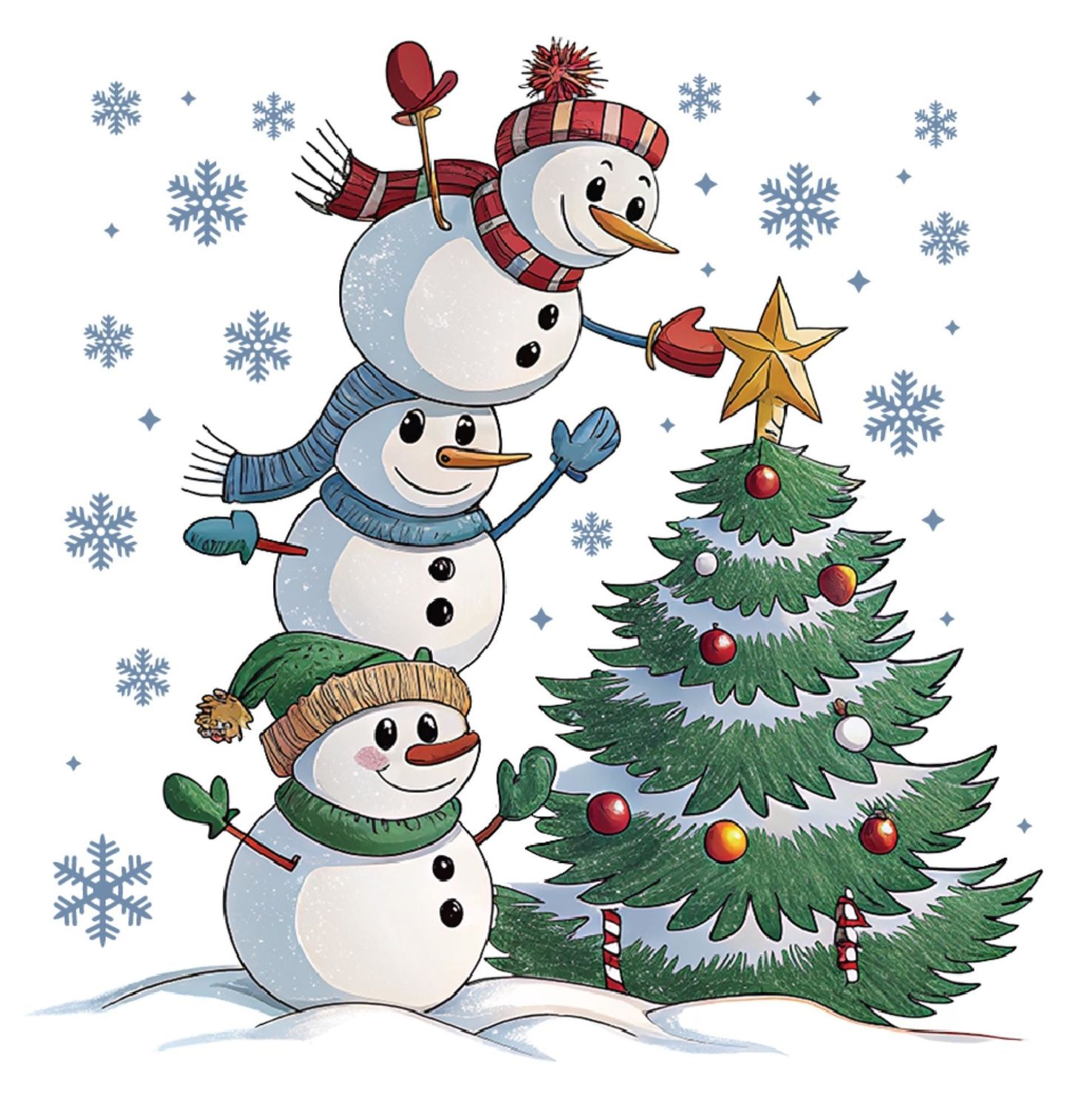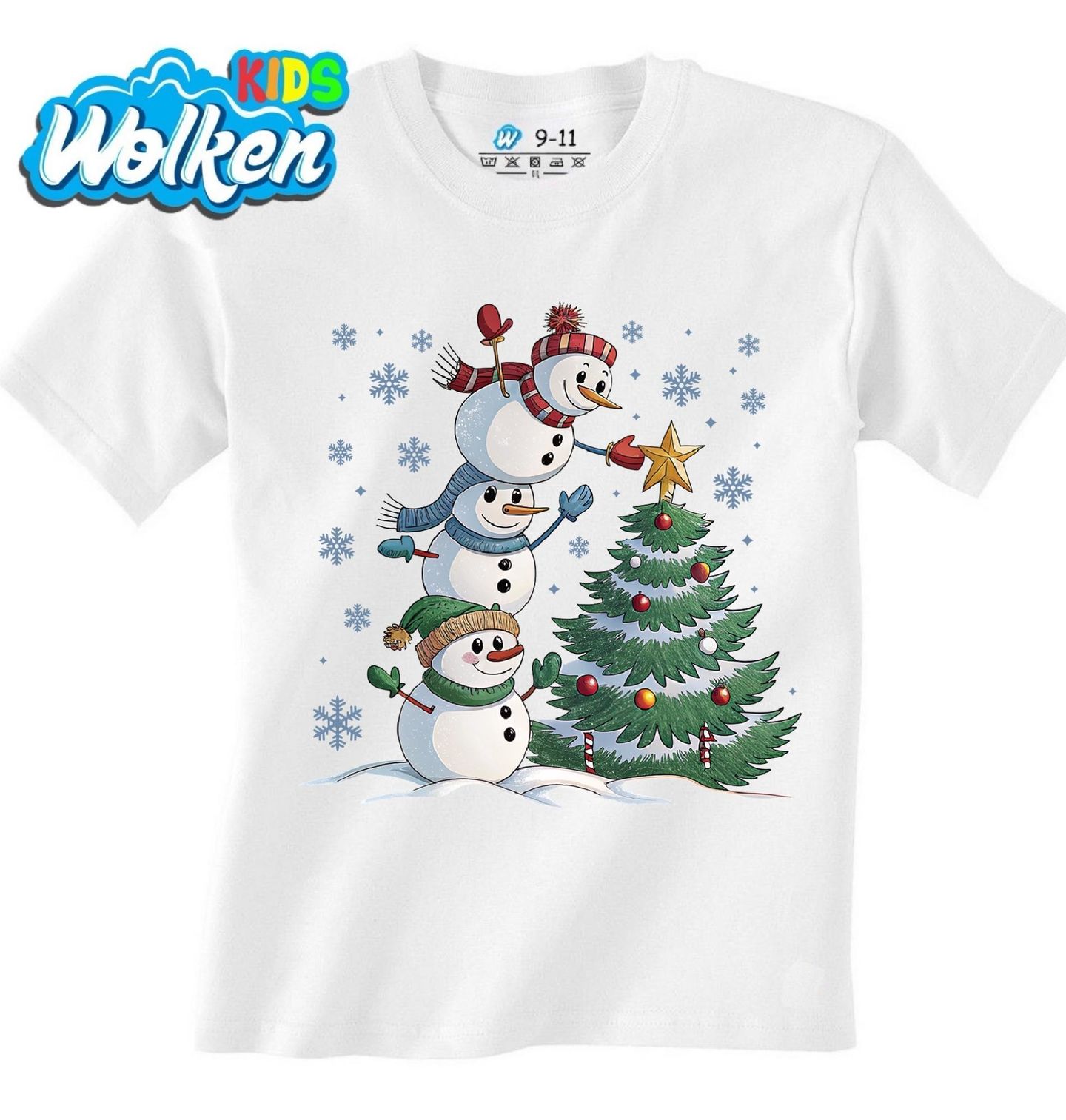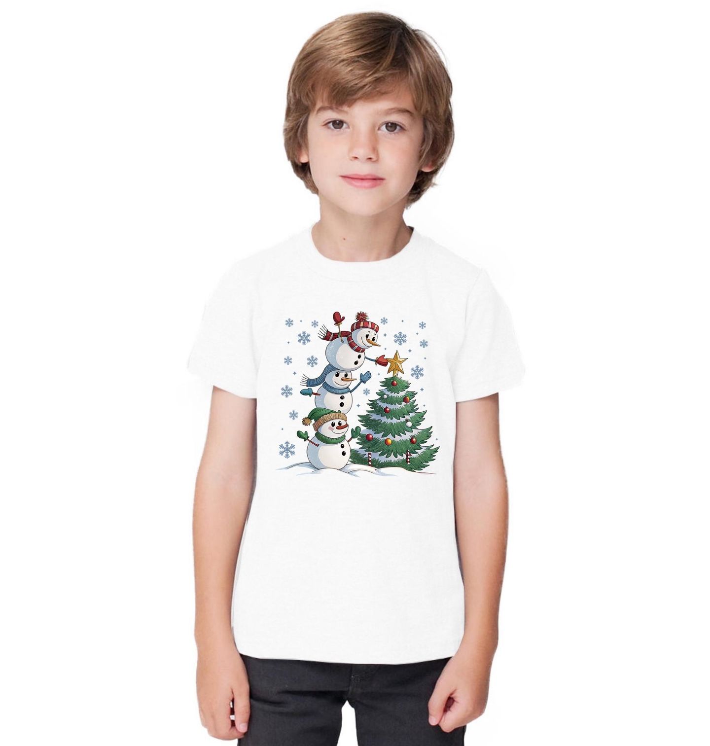 Dětské tričko Vánoční Tým Sněhuláků. Rozkošný motiv tří sněhuláků, kteří si společně pomáhají ozdobit vánoční stromeček, rozjasní každé Vánoce! Tato veselá scéna plná sněhových vloček, smíchu a pohody vykouzlí úsměv na tváři malým i velkým.