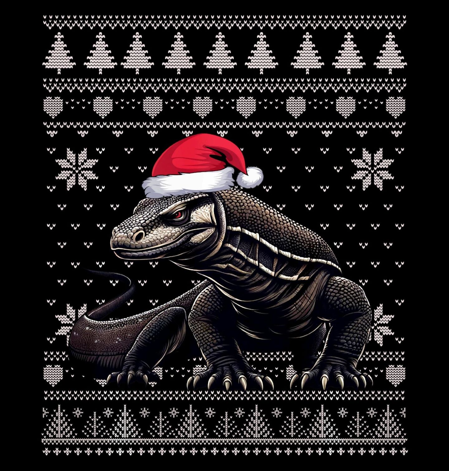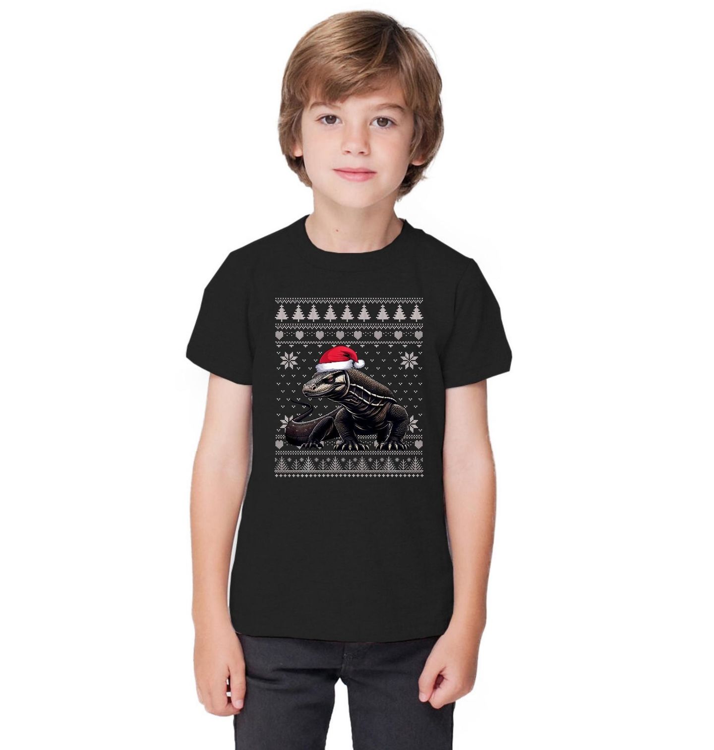Dětské tričko Vánoční Varan komodský. Stylový motiv „ugly sweater“ spojuje Vánoce a neobvyklého mazlíčka – plaza varana. Varan komodský, známý také jako komodský drak, je velký ještěr obývající indonéské ostrovy Komodo. Je to největší zástupce čeledi varanovitých a nejmohutnější žijící ještěr vůbec.
