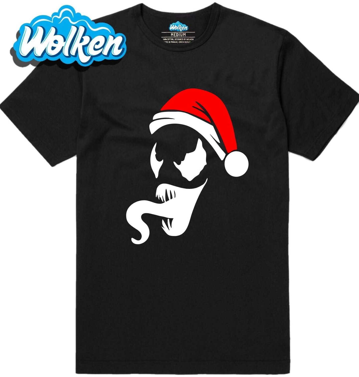 Pánské tričko Vánoční Venom. Na obrázku je slavný komiksový antihrdina Venom v červené čepici santa, který dodává svátkům pořádně drsný nádech. Vánoce s tímto designem rozhodně nebudou nudné. Ideální pro fanoušky komiksů, Marvel světa a Vánoc.