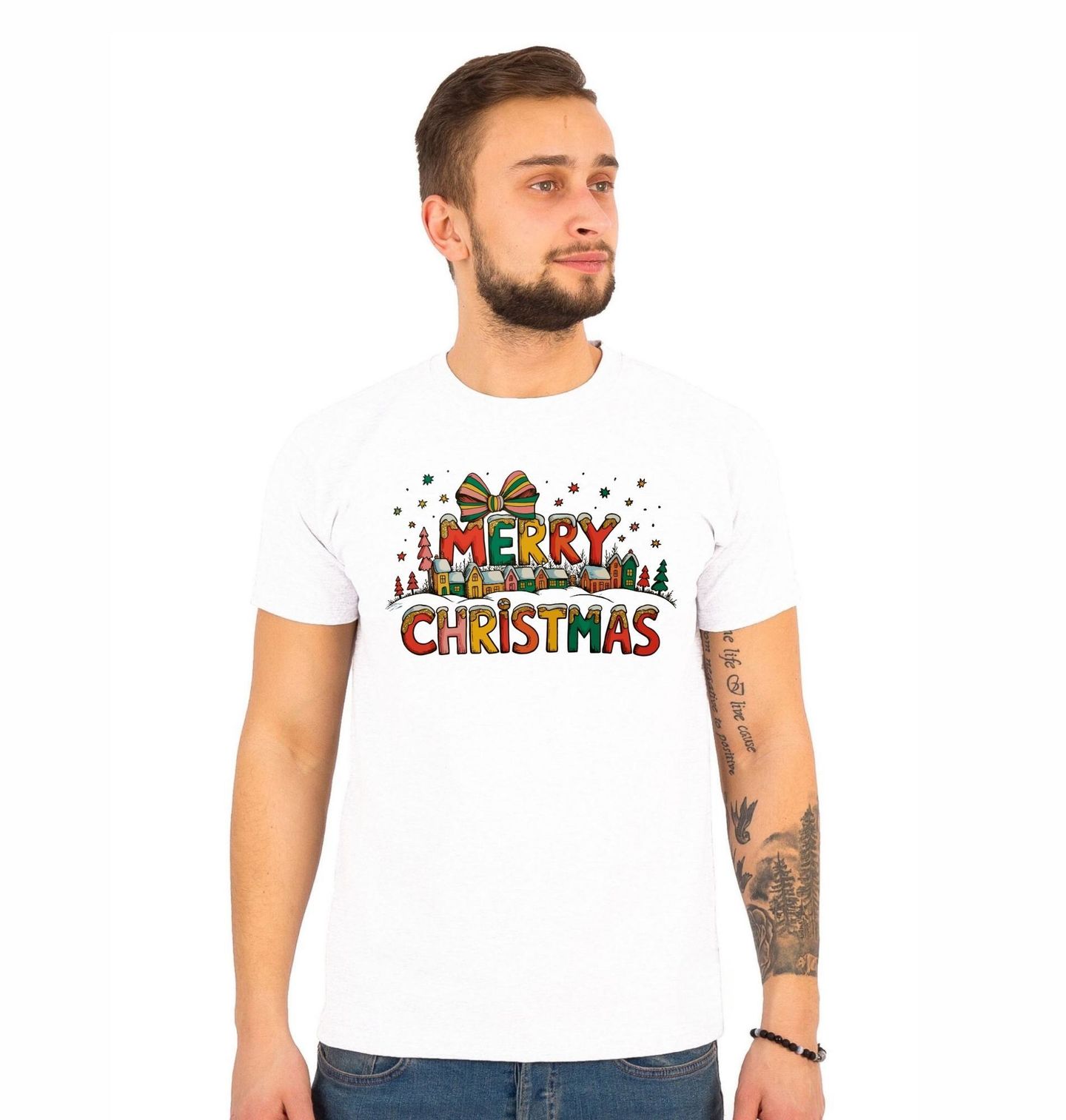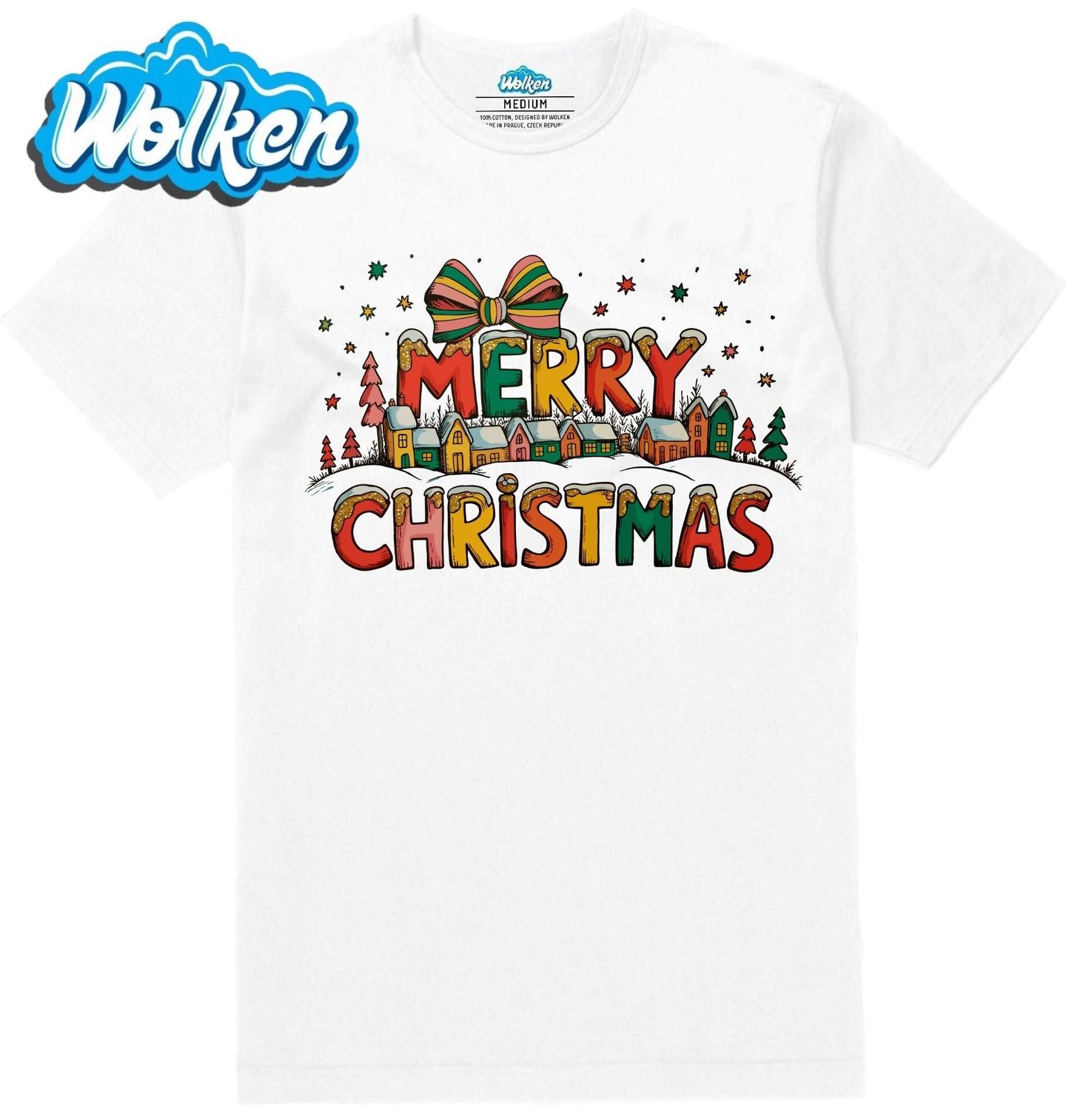 Pánské tričko Vánoční Vesnička. Tento kouzelný motiv s nápisem Merry Christmas přináší hřejivou atmosféru malované zimní vesničky, zasněžených domků a vánoční výzdoby. Barevná písmena připomínají perníčky s polevou a celý motiv završuje krásná stužka jako symbol dárků a radosti.