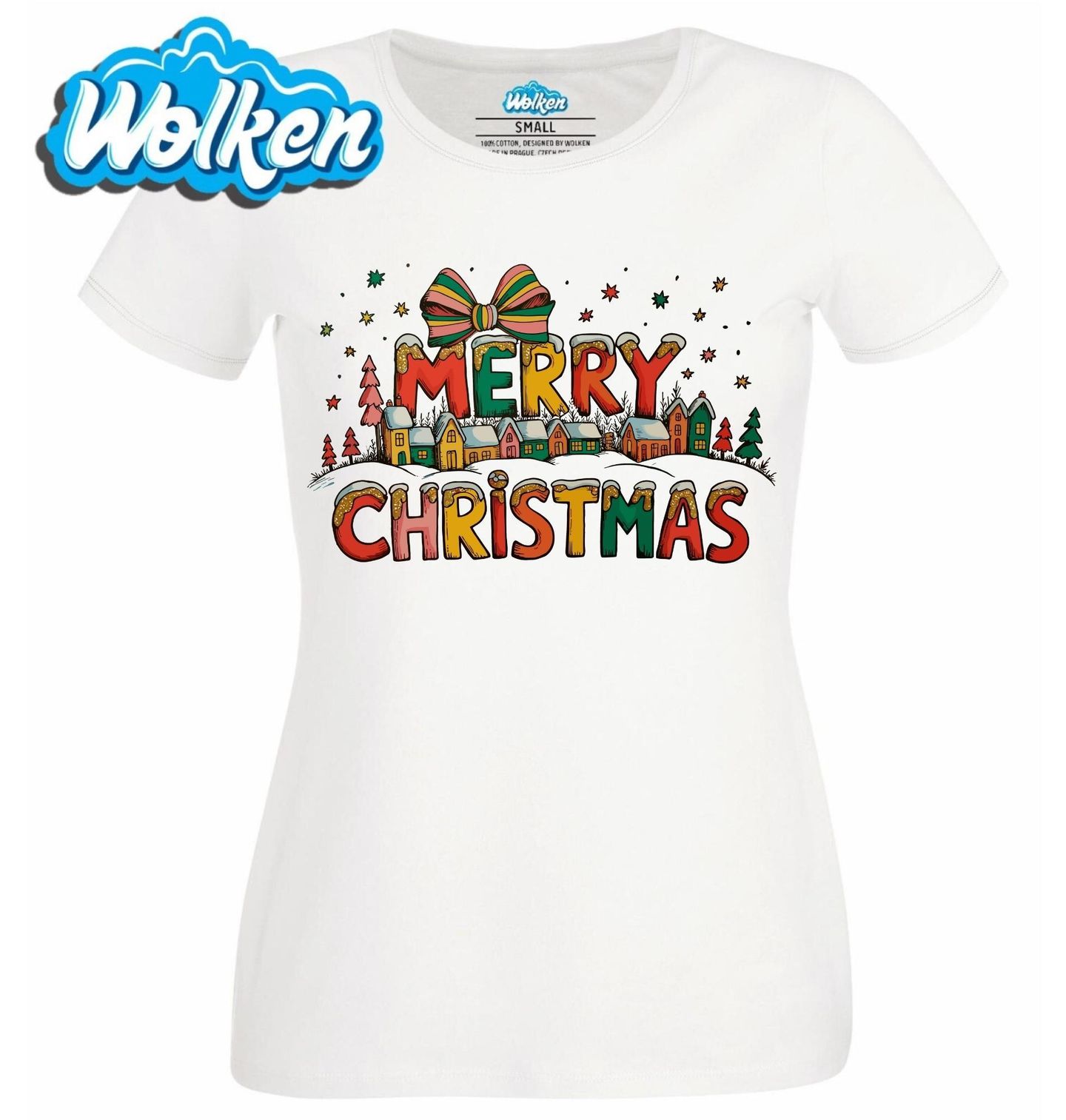 Dámské tričko Vánoční Vesnička. Tento kouzelný motiv s nápisem Merry Christmas přináší hřejivou atmosféru malované zimní vesničky, zasněžených domků a vánoční výzdoby. Barevná písmena připomínají perníčky s polevou a celý motiv završuje krásná stužka jako symbol dárků a radosti.