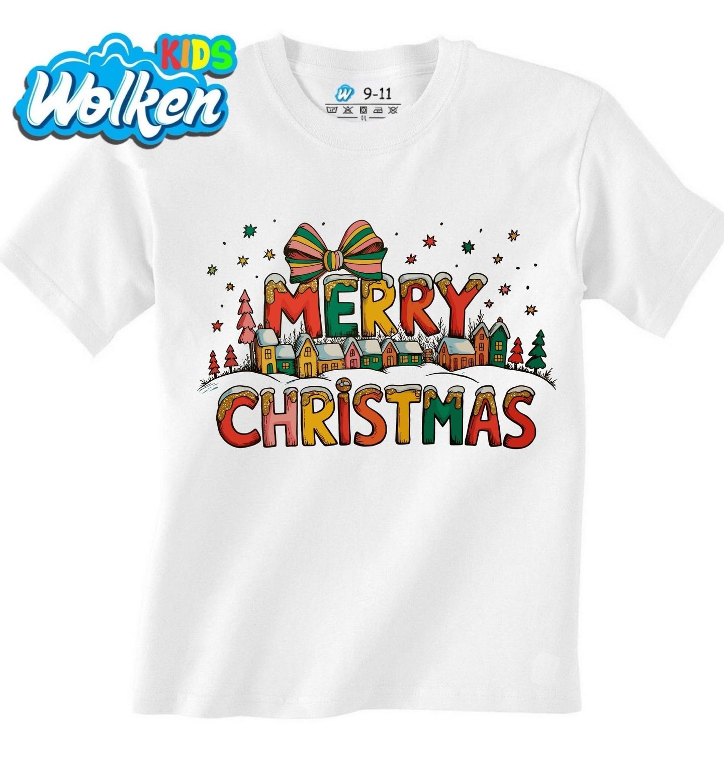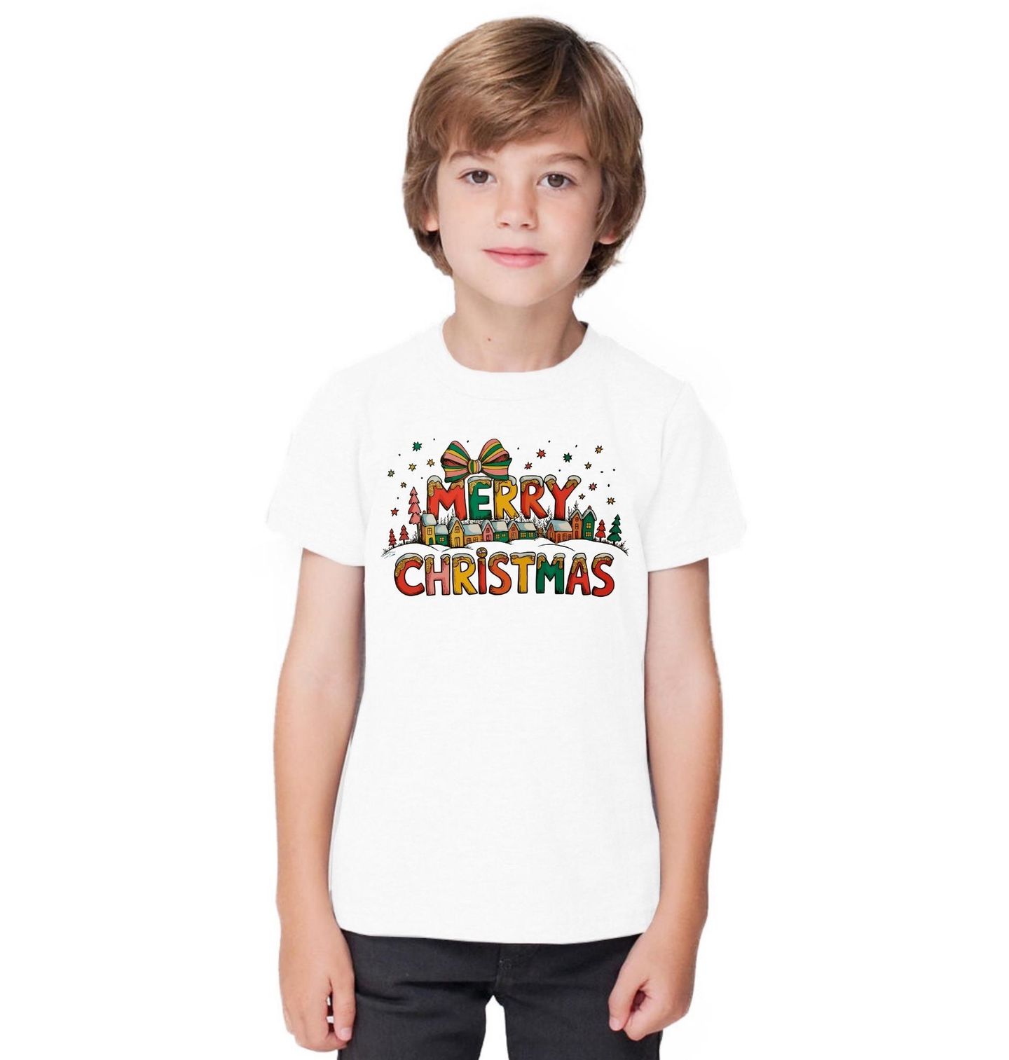 Dětské tričko Vánoční Vesnička. Tento kouzelný motiv s nápisem Merry Christmas přináší hřejivou atmosféru malované zimní vesničky, zasněžených domků a vánoční výzdoby. Barevná písmena připomínají perníčky s polevou a celý motiv završuje krásná stužka jako symbol dárků a radosti.