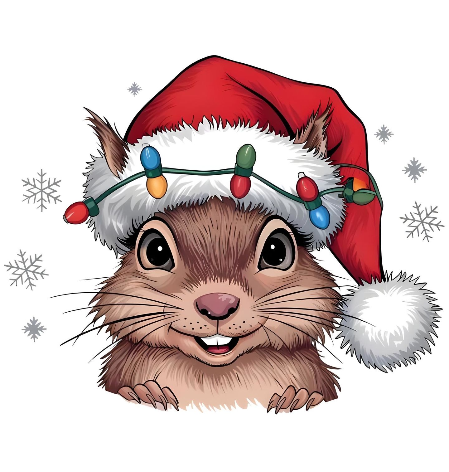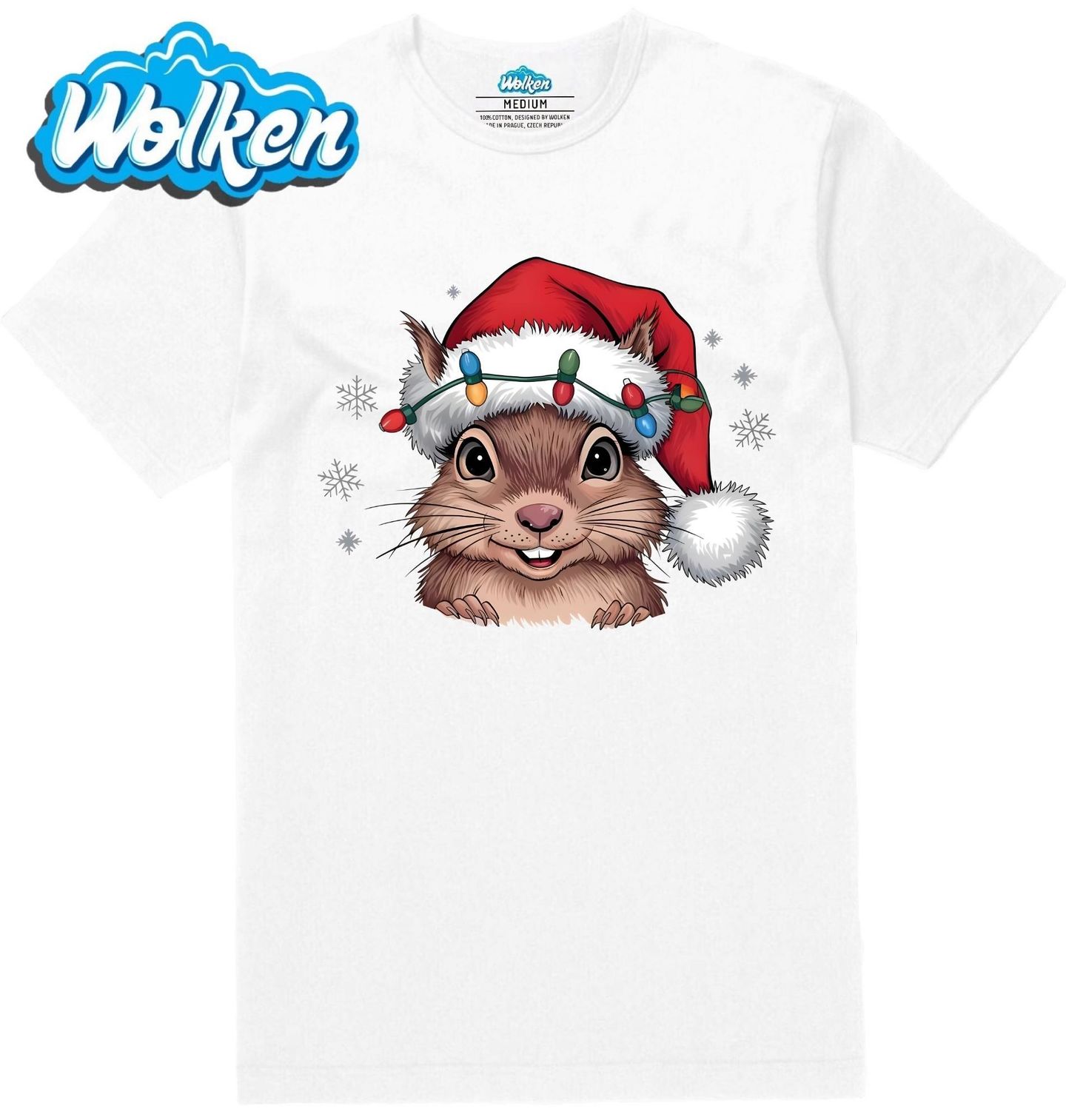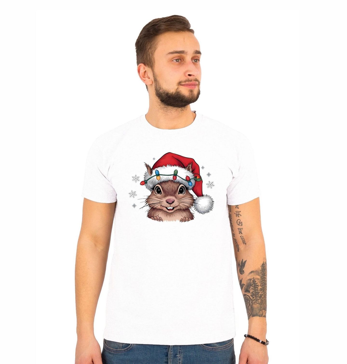 Pánské tričko Vánoční Veverka v Čepici. Roztomilá veverka ve vánoční čepici s barevnými světýlky – to je motiv, který potěší každého milovníka sváteční nálady i zvířat. Ideální pro Vánoce, dárky nebo jako hravý zimní outfit. Tento veselý hlodavec v sobě nese radost, pohodu a špetku vánoční magie.