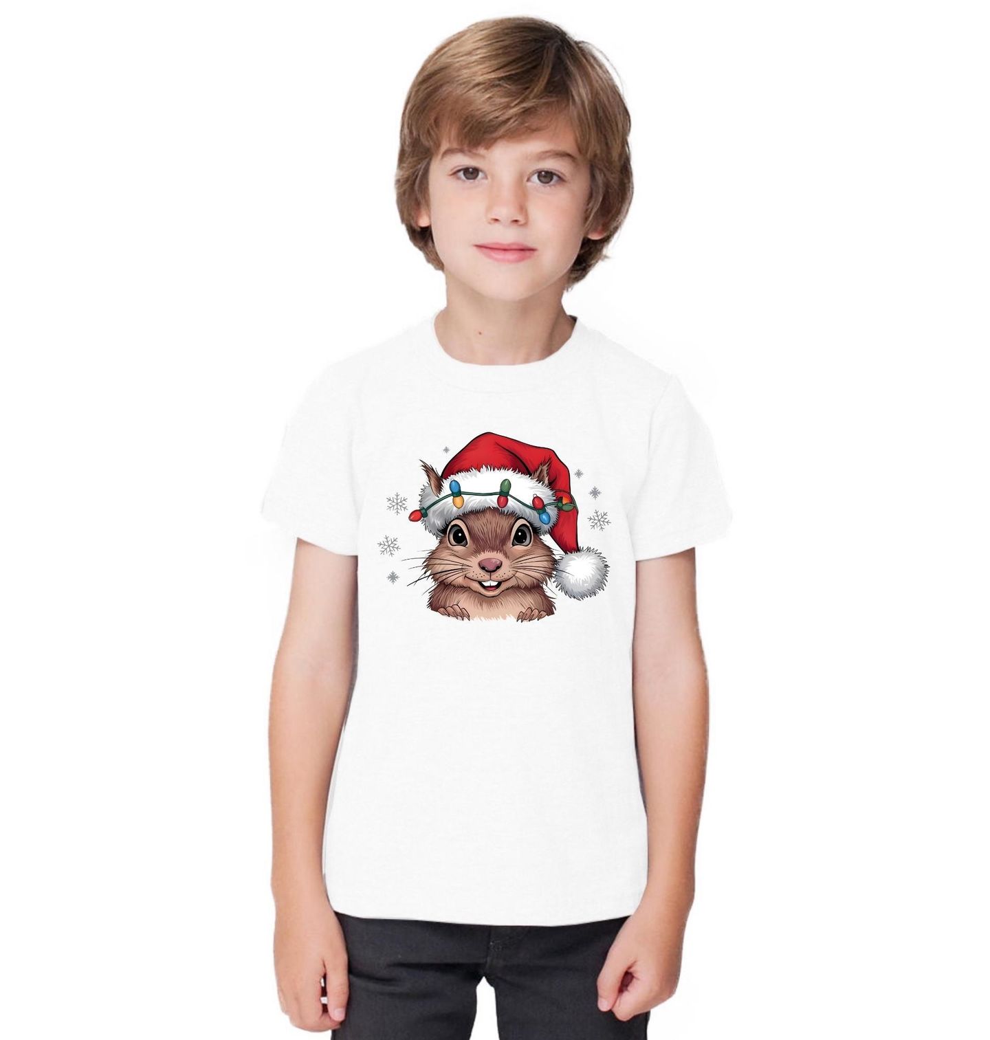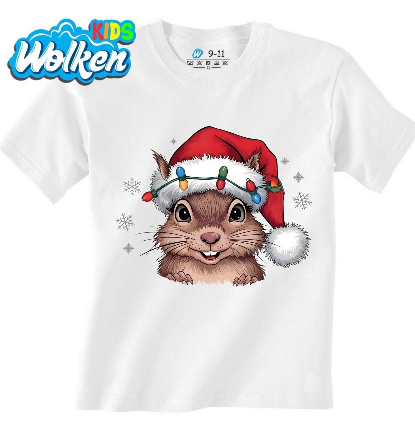 Dětské tričko Vánoční Veverka v Čepici. Roztomilá veverka ve vánoční čepici s barevnými světýlky – to je motiv, který potěší každého milovníka sváteční nálady i zvířat. Ideální pro Vánoce, dárky nebo jako hravý zimní outfit. Tento veselý hlodavec v sobě nese radost, pohodu a špetku vánoční magie.
