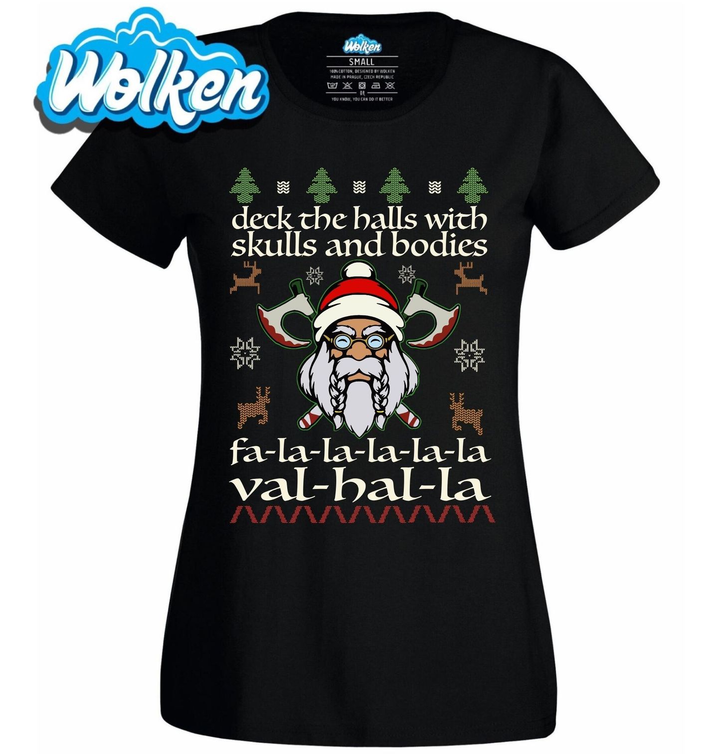 Dámské tričko Vánoční Viking. Zapomeň na klasické cukroví a zvonečky – přichází sváteční sezóna pro pravé válečníky! Tento neotřelý ugly sweater motiv s vikingským Santou, zkříženými sekerami a textem "Deck the halls with skulls and bodies, fa-la-la-la-la-la-la-val-hal-la" je dokonalý pro každého, kdo miluje Vánoce s pořádnou dávkou metalu, vikingů a černého humoru.