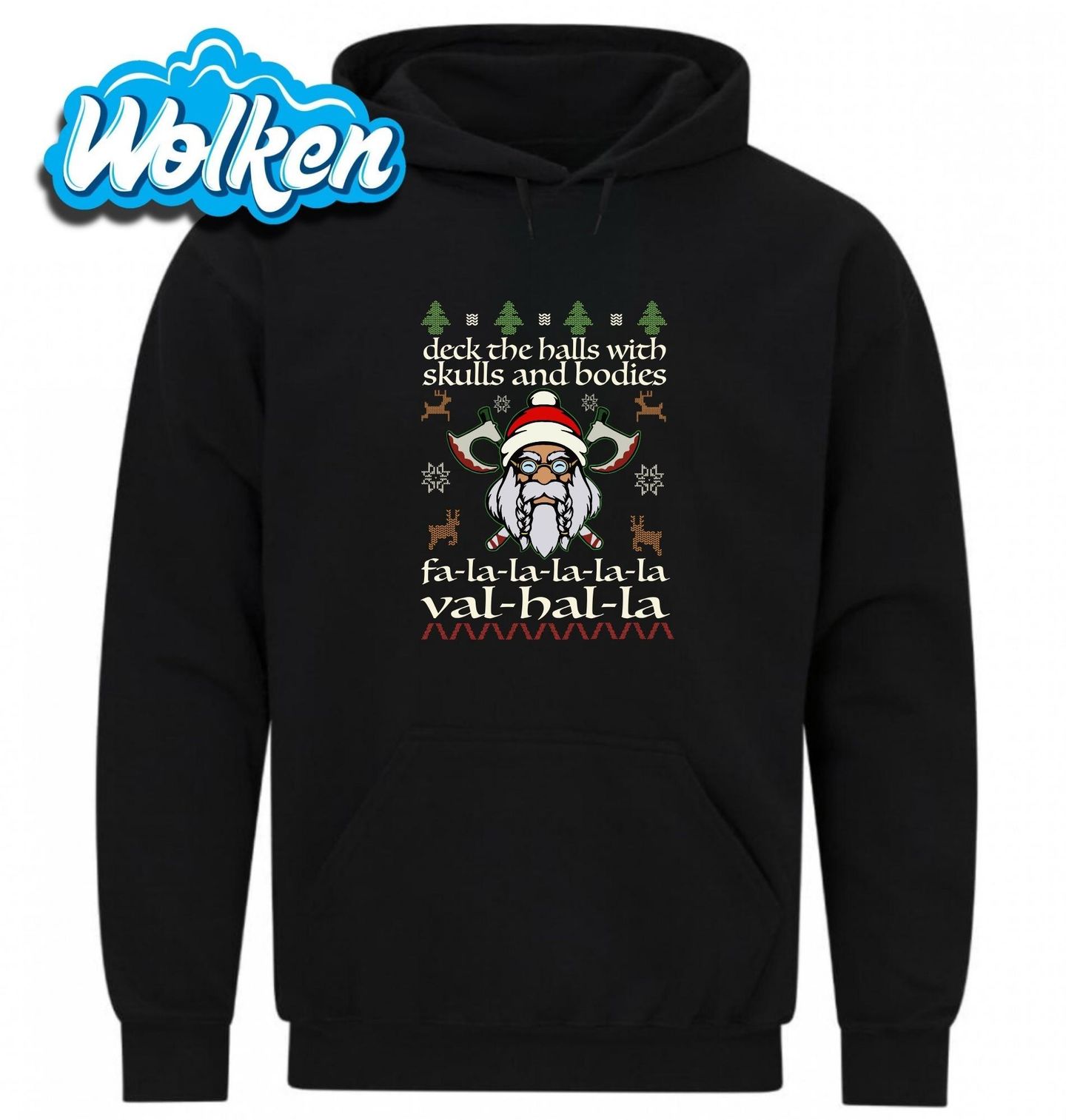Pánská mikina Vánoční Viking. Zapomeň na klasické cukroví a zvonečky – přichází sváteční sezóna pro pravé válečníky! Tento neotřelý ugly sweater motiv s vikingským Santou, zkříženými sekerami a textem "Deck the halls with skulls and bodies, fa-la-la-la-la-la-la-val-hal-la" je dokonalý pro každého, kdo miluje Vánoce s pořádnou dávkou metalu, vikingů a černého humoru.