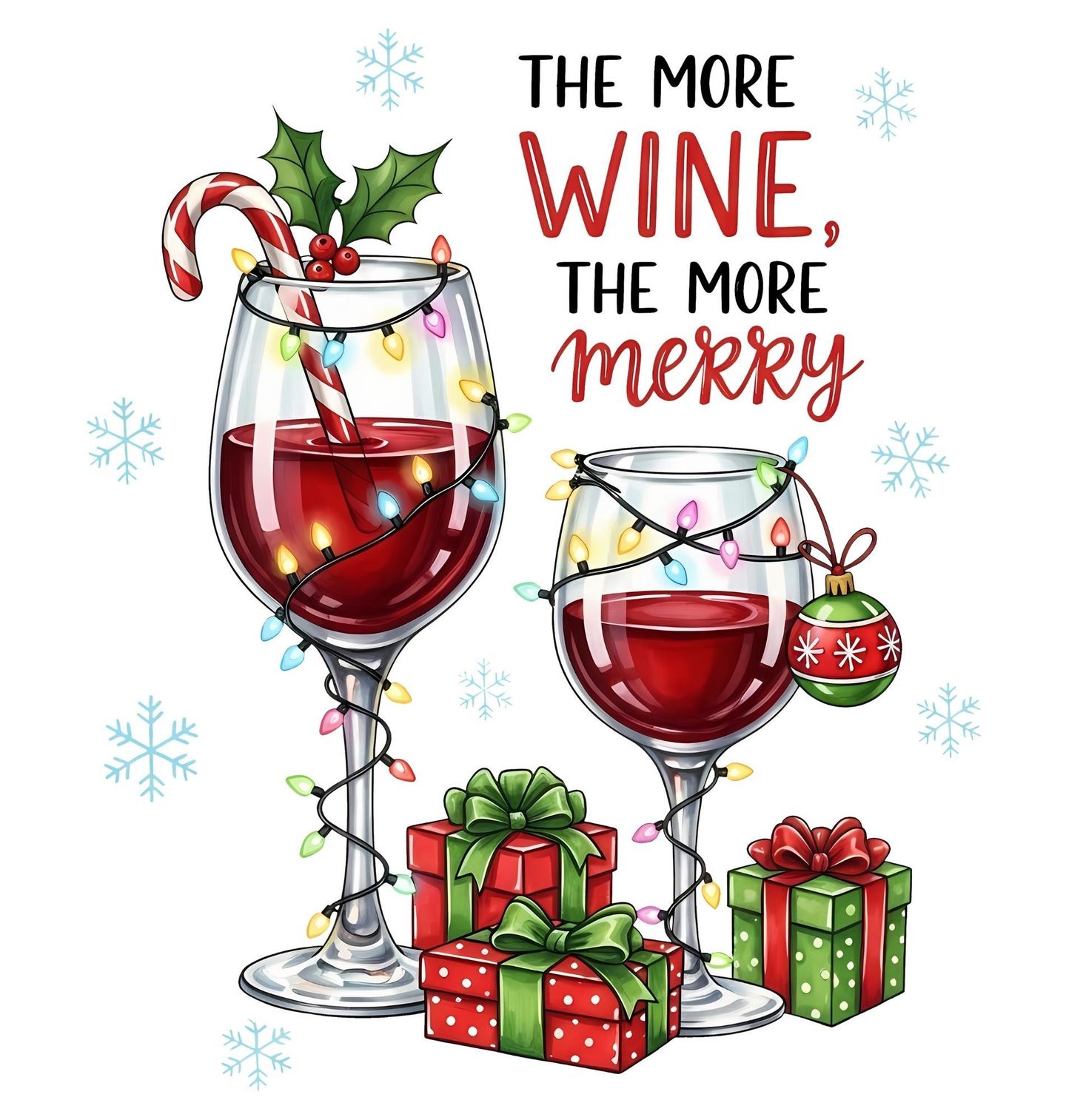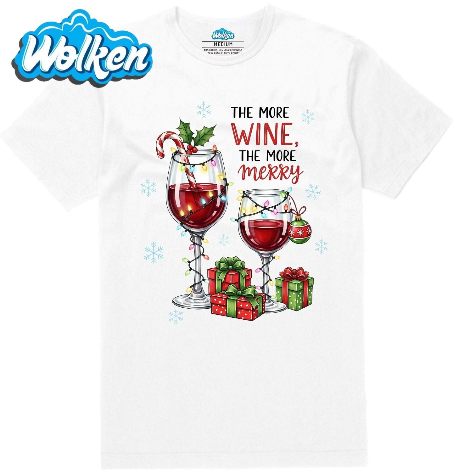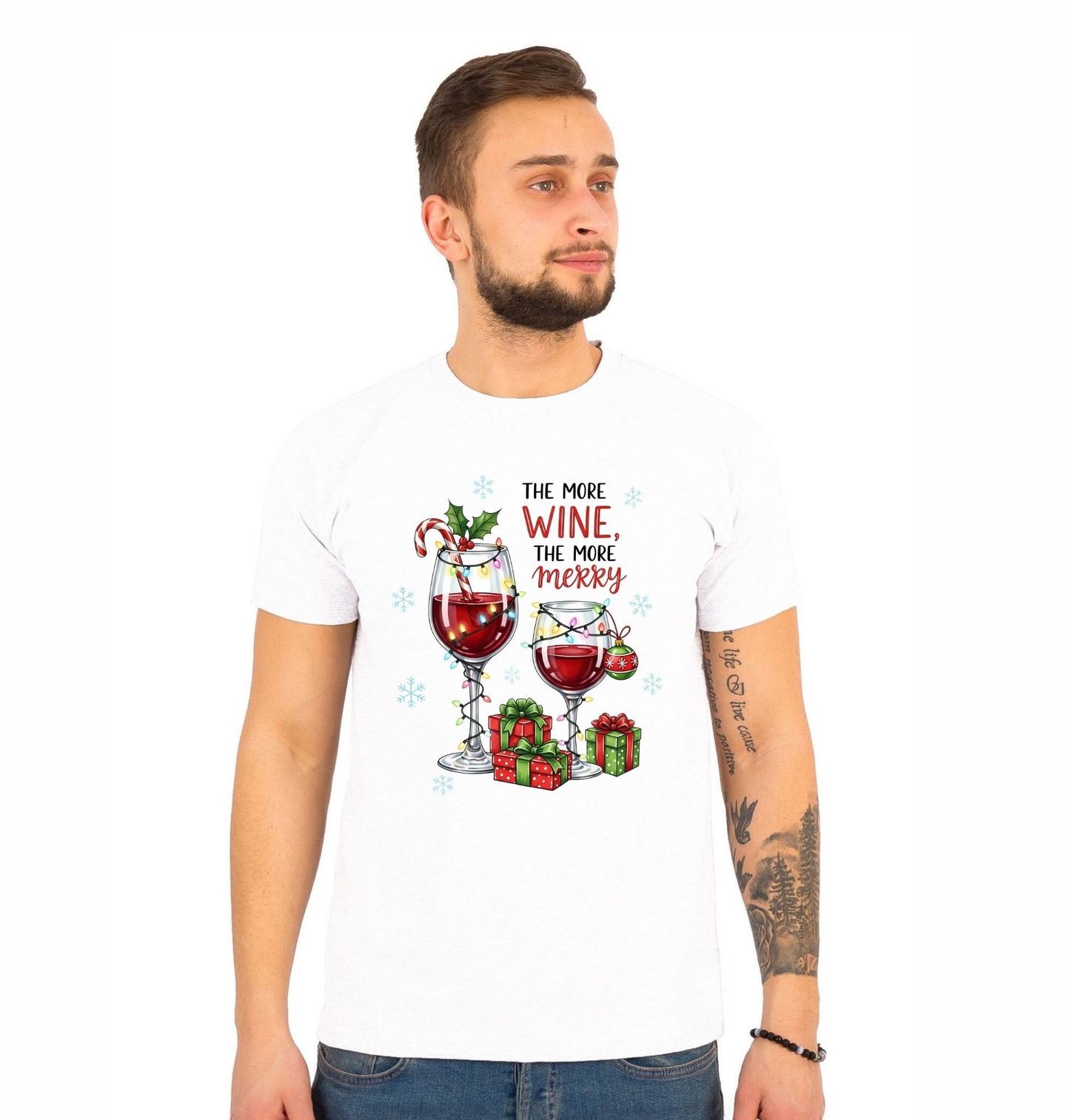 Pánské tričko Vánoční Víno Radosti. "The more wine, the more merry" (čím víc vína, tím víc radosti) přináší dokonalou dávku humoru i elegance do vánočního období. Dva sklenky vína ozdobené světýlky, cukrovou hůlkou, dárky a ozdobou připomínají, že Vánoce jsou nejen o dárkách, ale i o dobrém alkoholu a uvolněné párty.