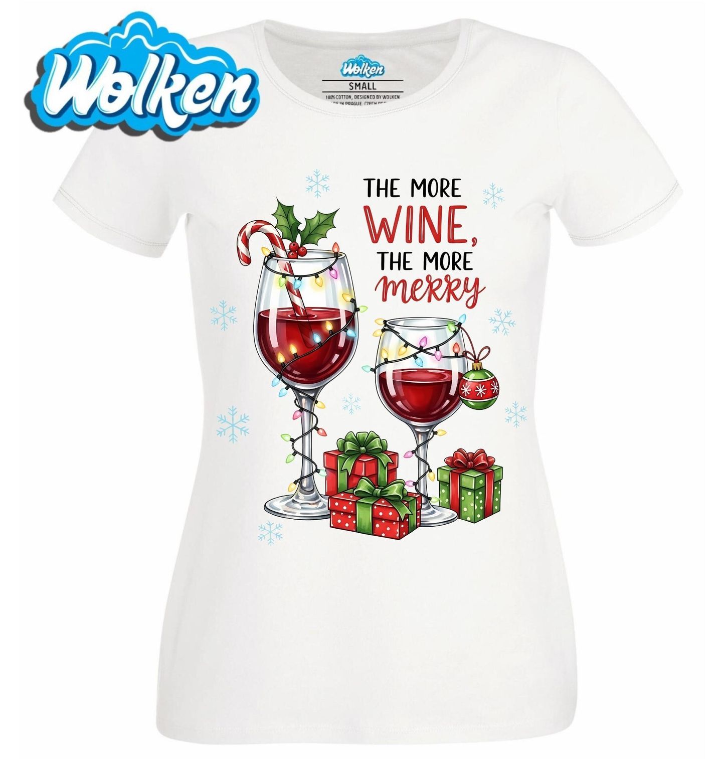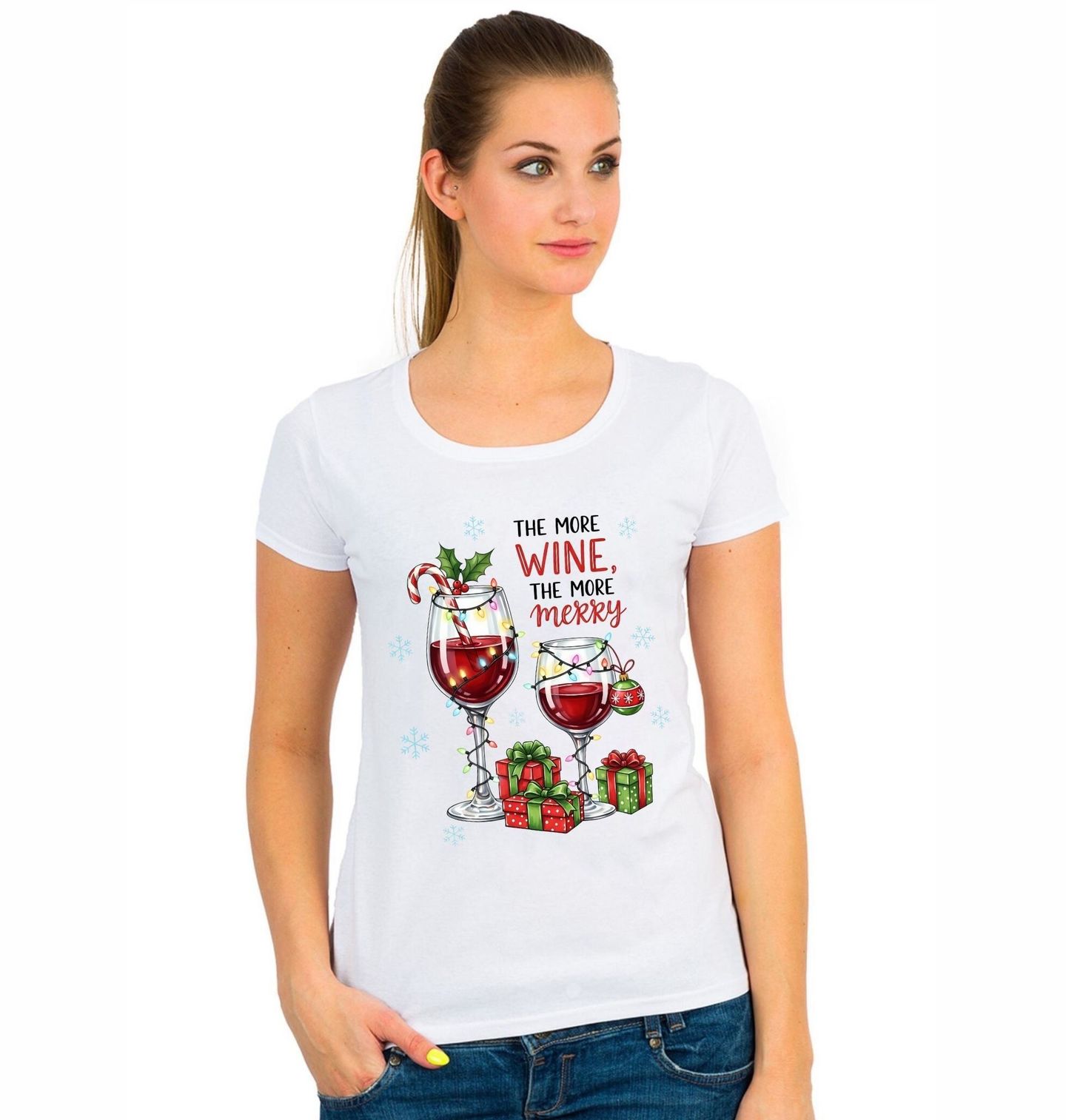 Dámské tričko Vánoční Víno Radosti. "The more wine, the more merry" (čím víc vína, tím víc radosti) přináší dokonalou dávku humoru i elegance do vánočního období. Dva sklenky vína ozdobené světýlky, cukrovou hůlkou, dárky a ozdobou připomínají, že Vánoce jsou nejen o dárkách, ale i o dobrém alkoholu a uvolněné párty.