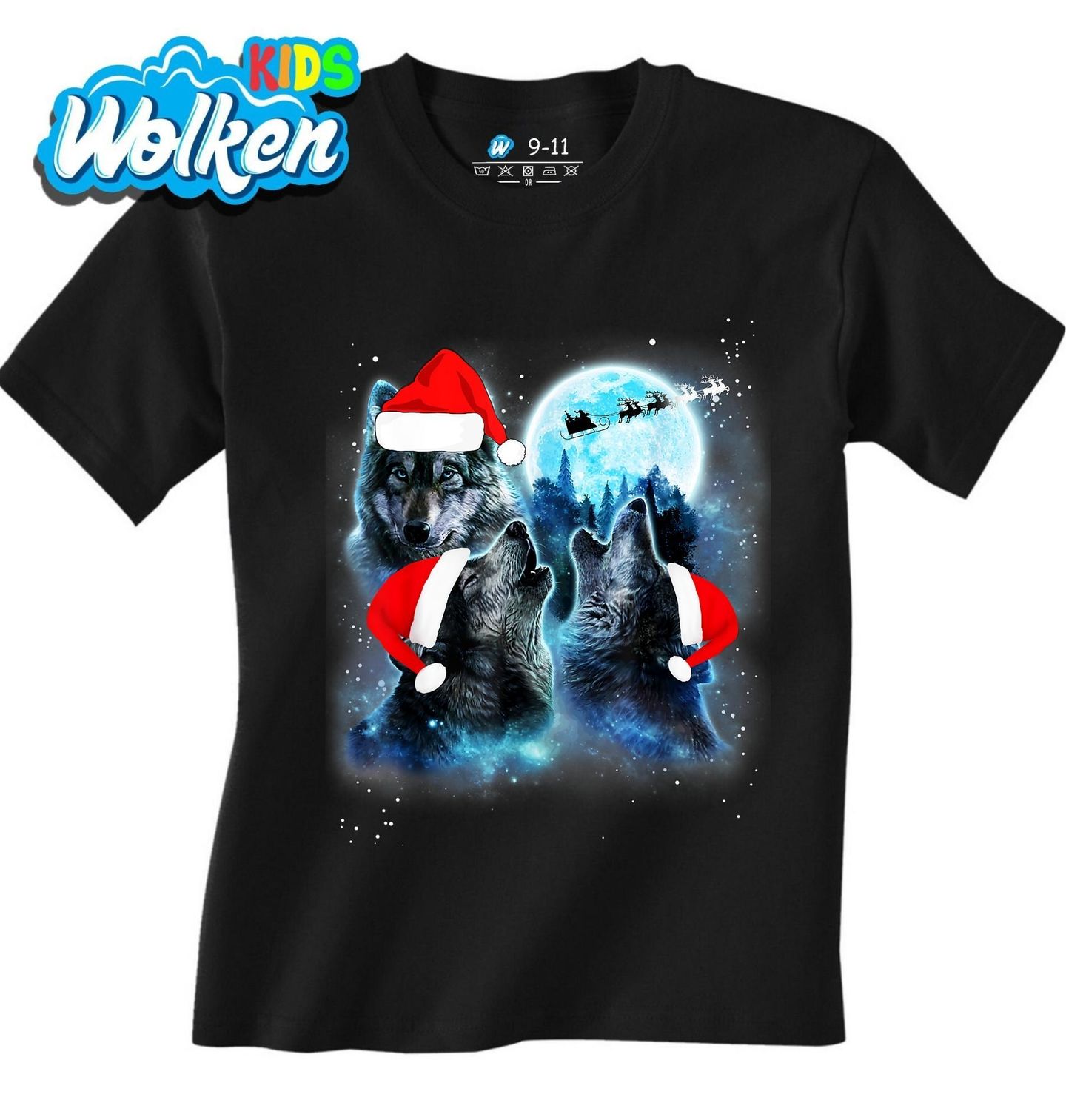 Dětské tričko Vánoční Vlci vyjící na Měsíc. Přichází zimní verze legendy! Tento vtipný a stylový motiv je poctou ikonickému designu „Three Wolf Moon“, který dobyl internet – tentokrát však ve svátečním stylu. Tři majestátní vlci vyjí k měsíci, zatímco na obloze letí sáně s Mikulášem a každý vlk má na hlavě veselou čepici Santa Clause. Ideální motiv na Vánoce.