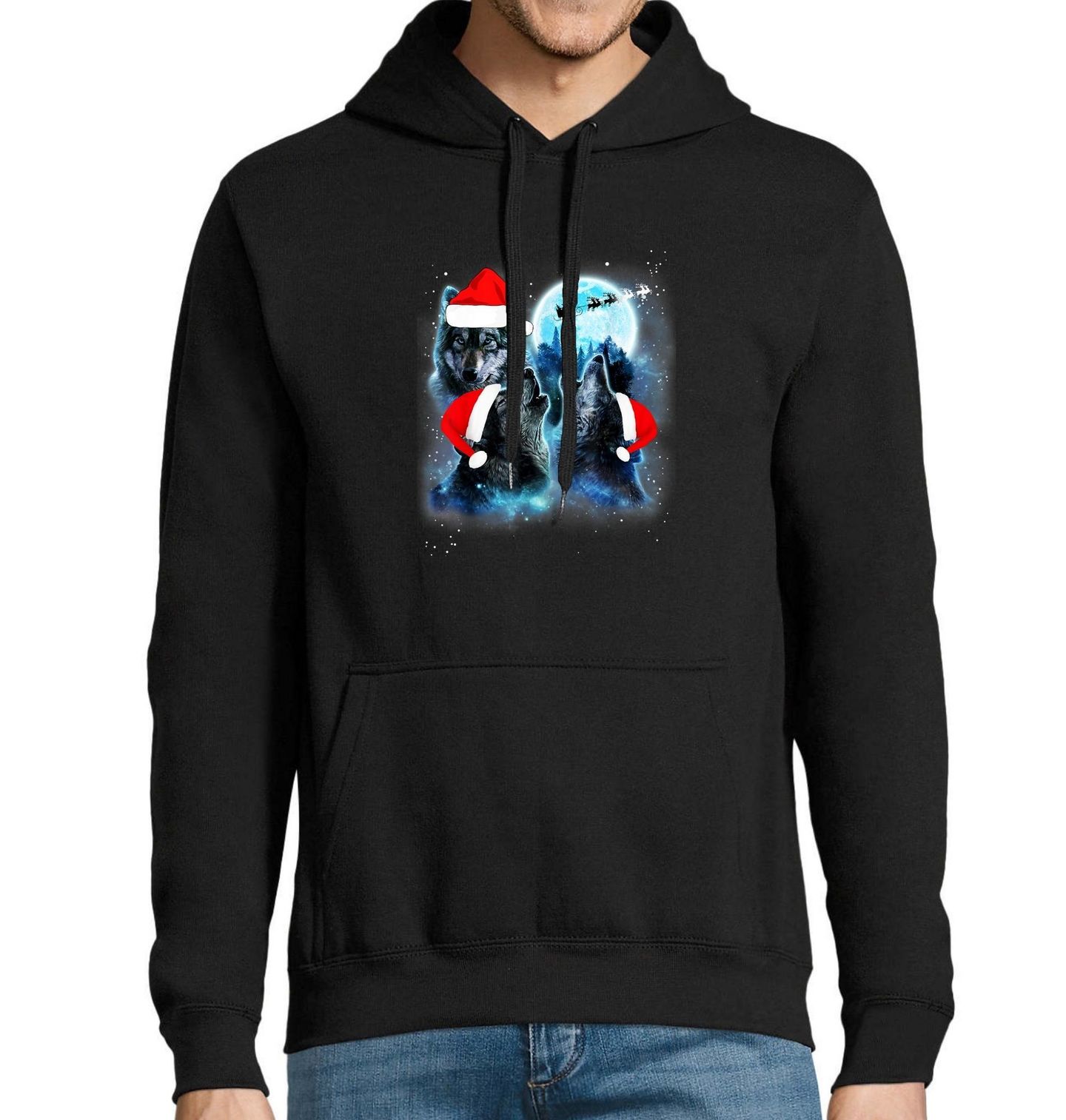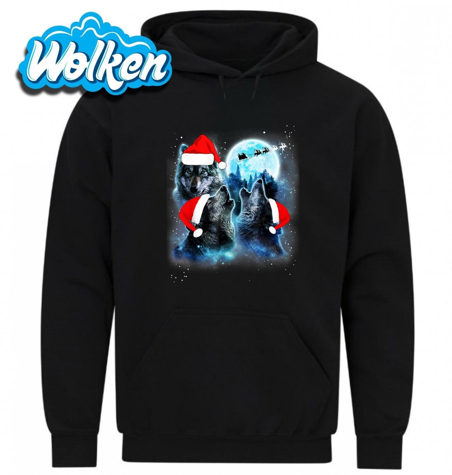 Pánská mikina Vánoční Vlci vyjící na Měsíc. Přichází zimní verze legendy! Tento vtipný a stylový motiv je poctou ikonickému designu „Three Wolf Moon“, který dobyl internet – tentokrát však ve svátečním stylu. Tři majestátní vlci vyjí k měsíci, zatímco na obloze letí sáně s Mikulášem a každý vlk má na hlavě veselou čepici Santa Clause. Ideální motiv na Vánoce.