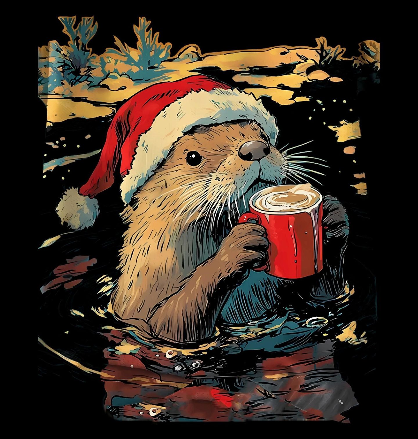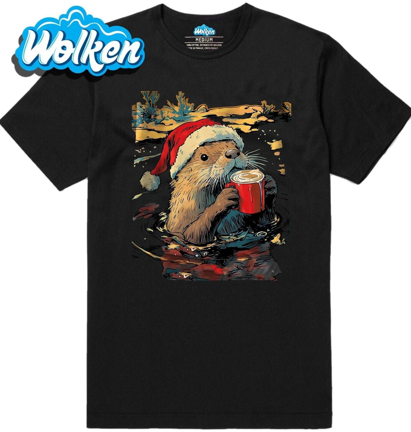Pánské tričko Vánoční Vydra s Horkou Čokoládou. Vydra jako symbol klidu a relaxace vám připomene, že Vánoce nejsou jen o shonu, ale i o čase zastavit se, odpočinout si a vychutnat si svůj oblíbený horký nápoj. Toto roztomilé zvíře v santovské čepici popíjí lahodnou horkou čokoládu ve vodě.