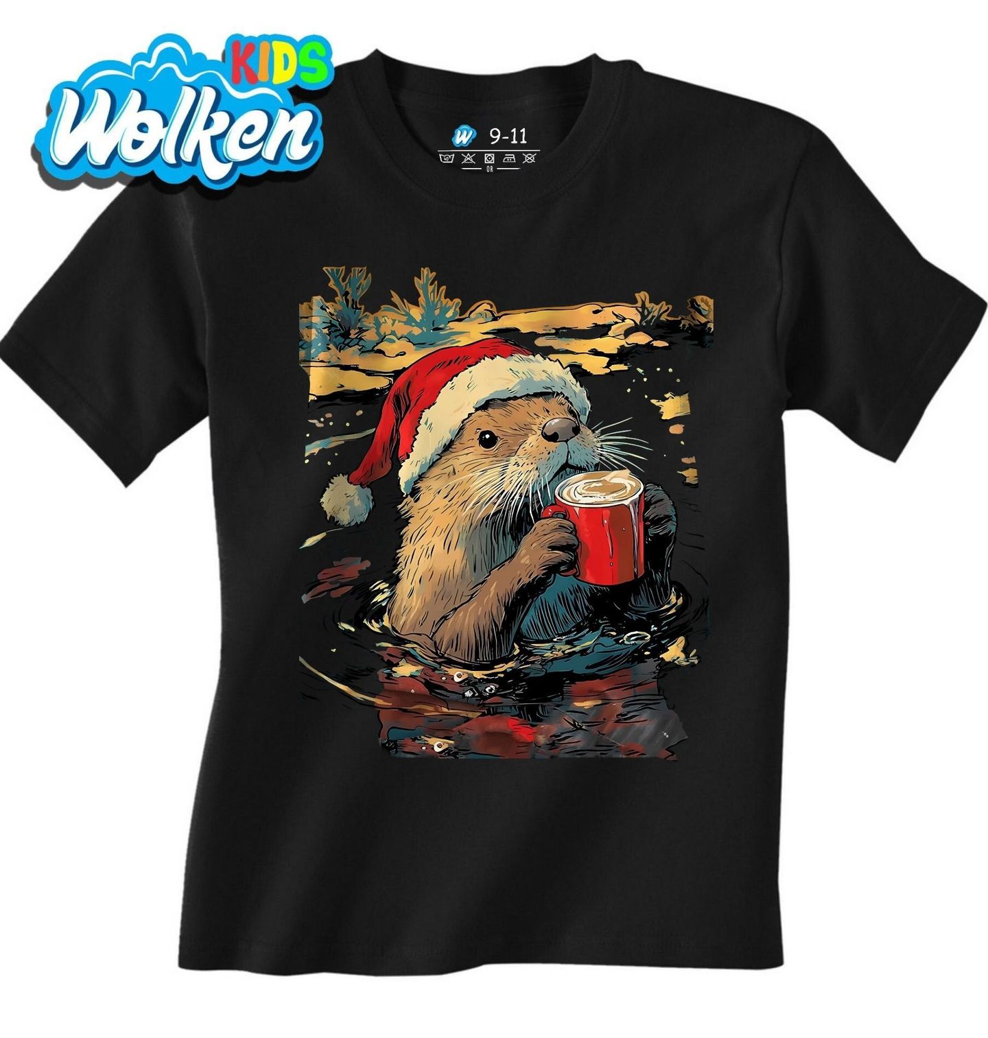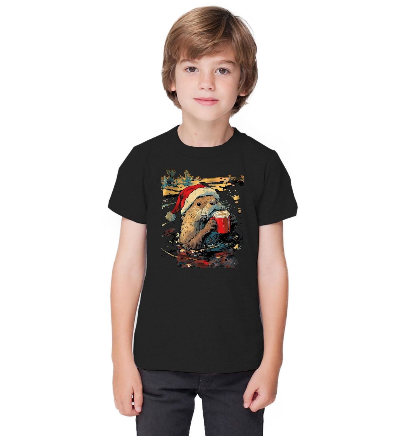 Dětské tričko Vánoční Vydra s Horkou Čokoládou. Vydra jako symbol klidu a relaxace vám připomene, že Vánoce nejsou jen o shonu, ale i o čase zastavit se, odpočinout si a vychutnat si svůj oblíbený horký nápoj. Toto roztomilé zvíře v santovské čepici popíjí lahodnou horkou čokoládu ve vodě.