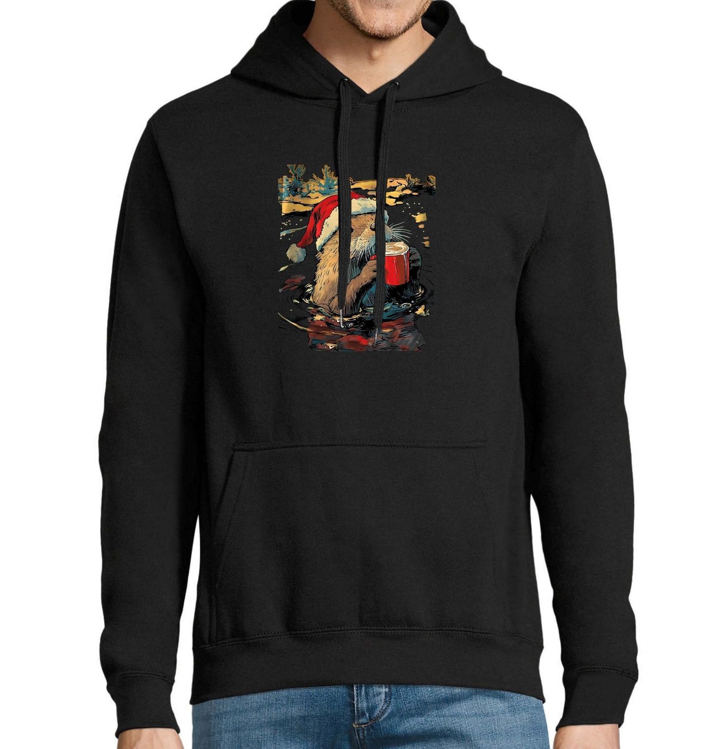 Pánská mikina Vánoční Vydra s Horkou Čokoládou. Vydra jako symbol klidu a relaxace vám připomene, že Vánoce nejsou jen o shonu, ale i o čase zastavit se, odpočinout si a vychutnat si svůj oblíbený horký nápoj. Toto roztomilé zvíře v santovské čepici popíjí lahodnou horkou čokoládu ve vodě.