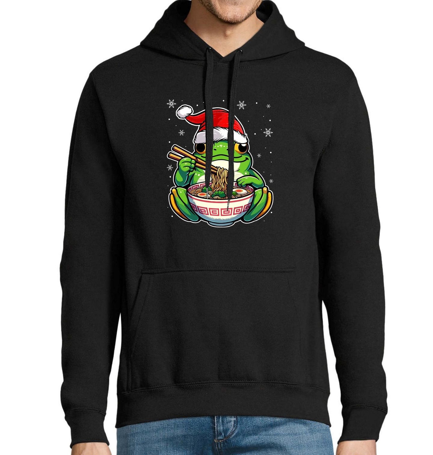 Pánská mikina Vánoční Žába a Ramen. Veselý motiv, kde hlavní roli hraje spokojená žába v čepici Santa Clause, si vychutnává misku horkého ramenu pod padajícími sněhovými vločkami. Skvělé pro každého, kdo miluje Vánoce, Japonsko, asijskou kuchyň i neotřelé vánoční motivy.
